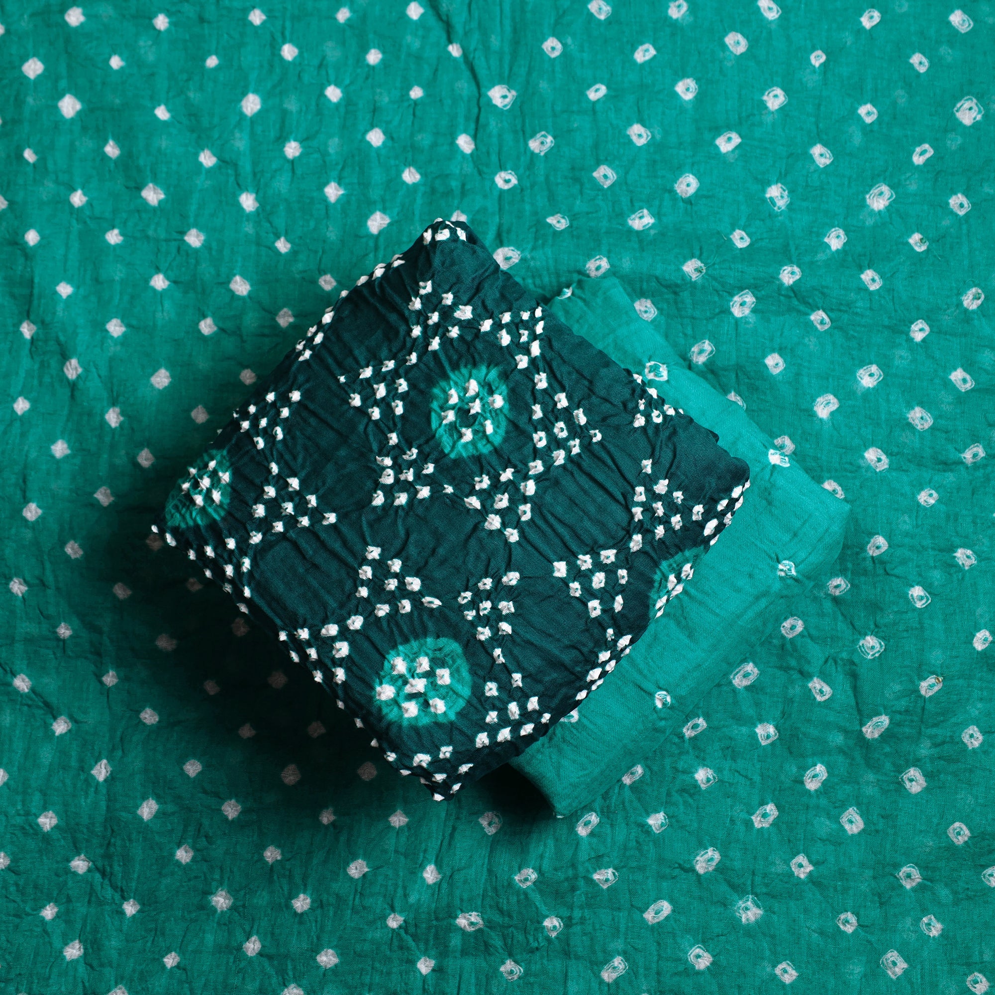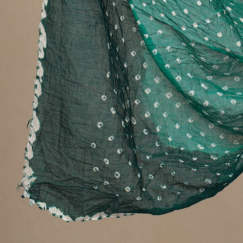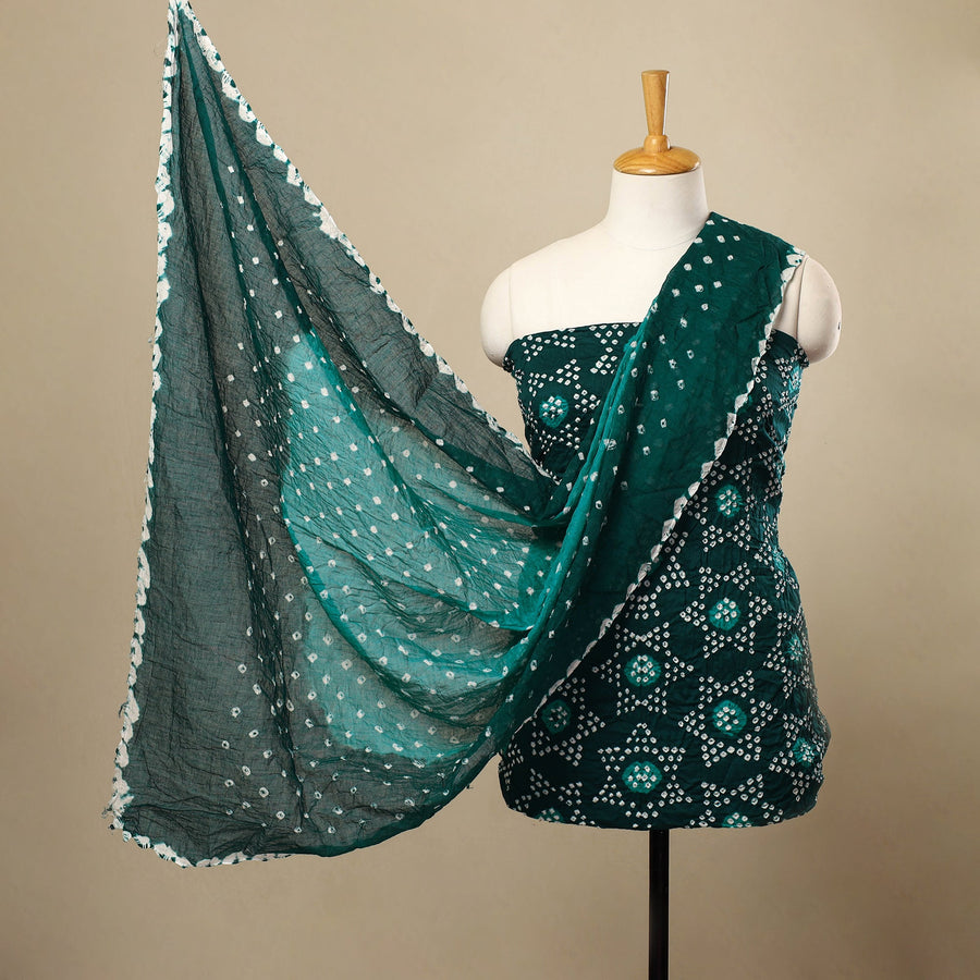 This green 3pc bandhani dress material brings alive the timeless tie-dye artistry of Kutch in vibrant hues and intricate patterns. Made from soft satin cotton, the set includes a kurta, matching bottom, and dupatta with all adorned with intricate patterns tied and dyed by hand. The detailed motifs are created using the traditional bandhani method. This set adds an elegant touch to your wardrobe.