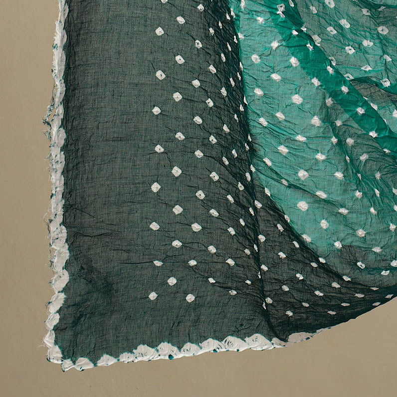 This green 3pc bandhani embroidery dress material brings alive the timeless tie-dye artistry of Kutch in vibrant hues and intricate patterns. Made from soft satin cotton, the set includes a kurta, matching bottom, and dupatta, all adorned with intricate patterns tied and dyed by hand. The detailed motifs are created using the traditional bandhani method. This set adds an elegant touch to your wardrobe.