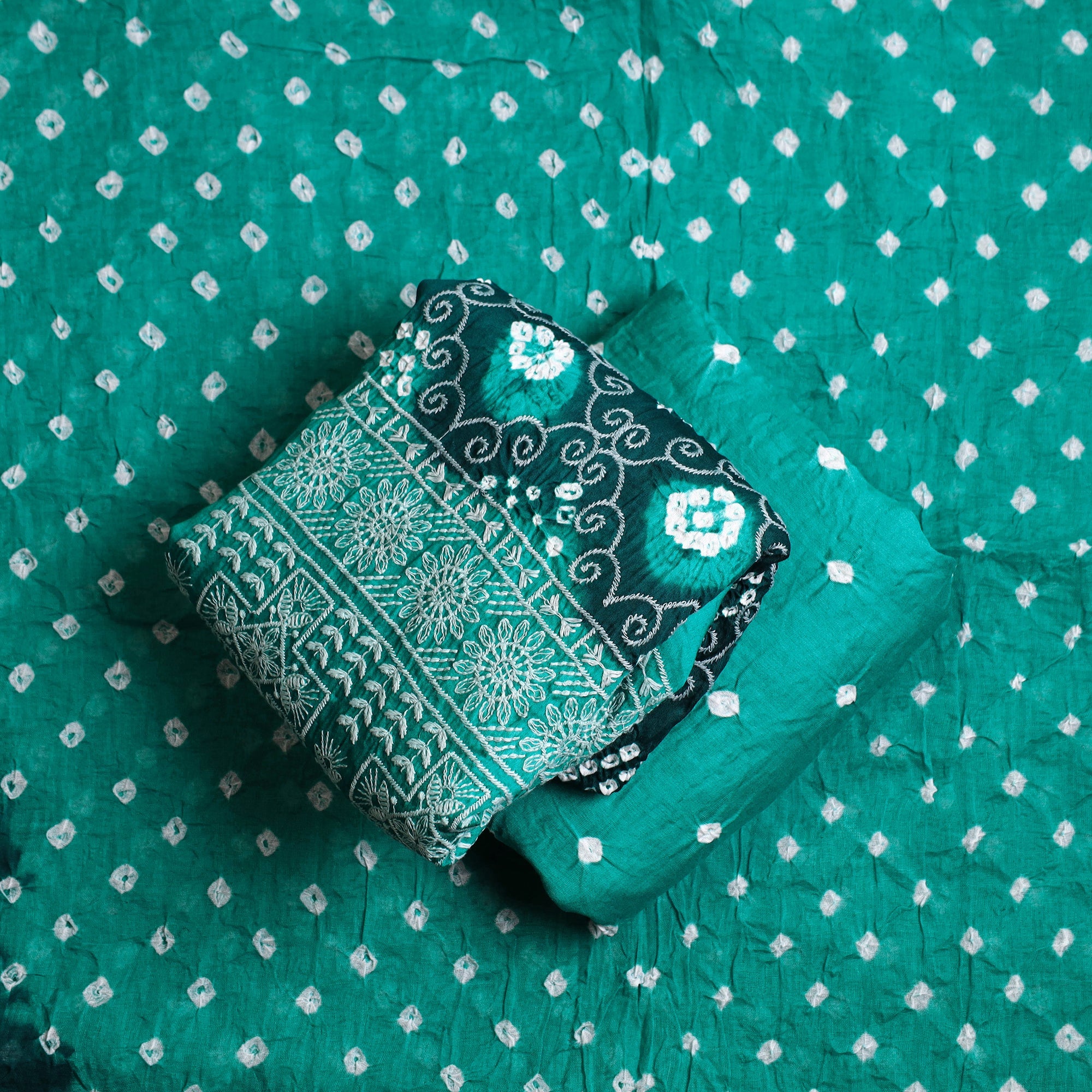 • Green 3pc Tie & Dye Satin Cotton Bandhani Dress Material