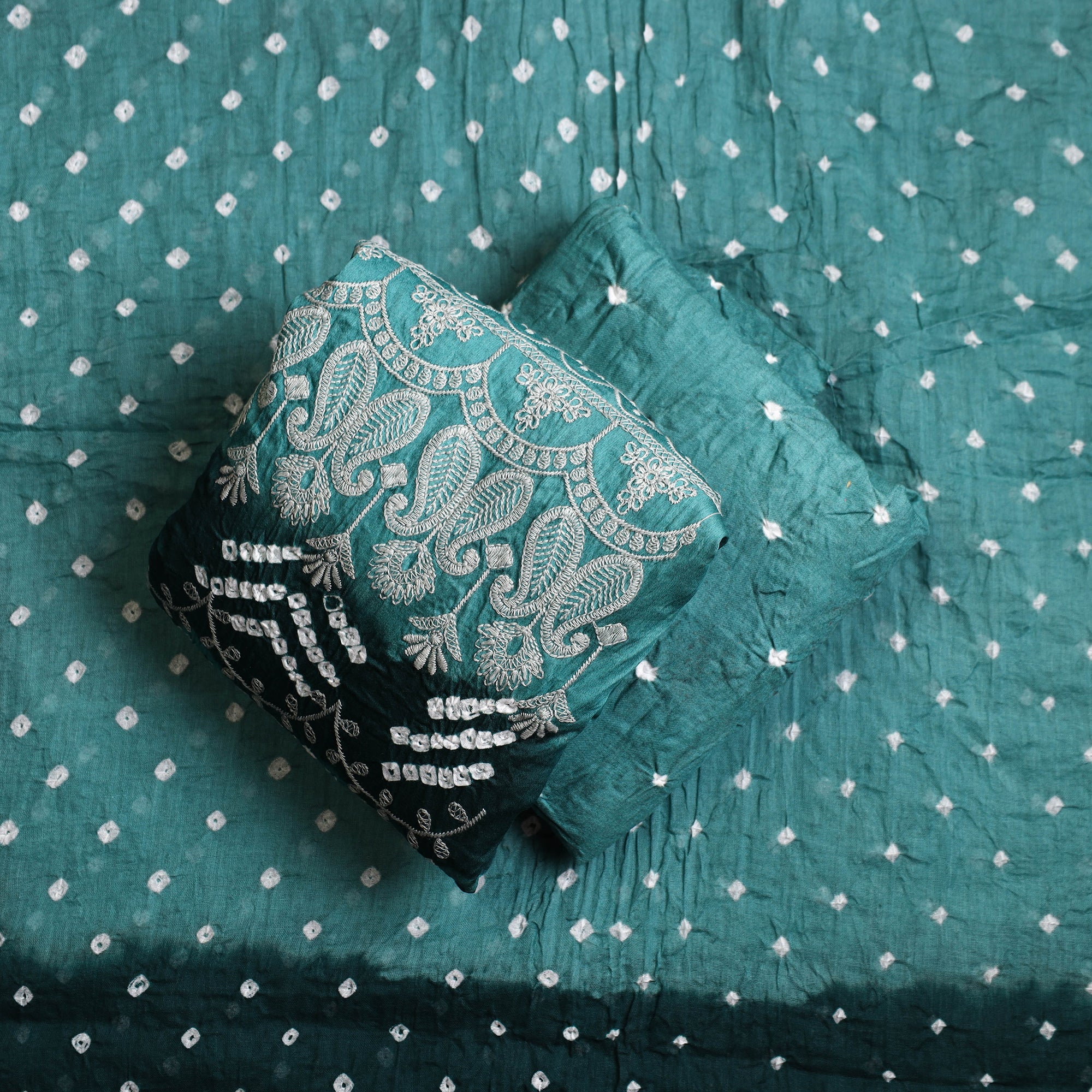 This green 3pc bandhani embroidery dress material brings alive the timeless tie-dye artistry of Kutch in vibrant hues and intricate patterns. Made from soft satin cotton, the set includes a kurta, matching bottom, and dupatta, all adorned with intricate patterns tied and dyed by hand. The detailed motifs are created using the traditional bandhani method. This set adds an elegant touch to your wardrobe.