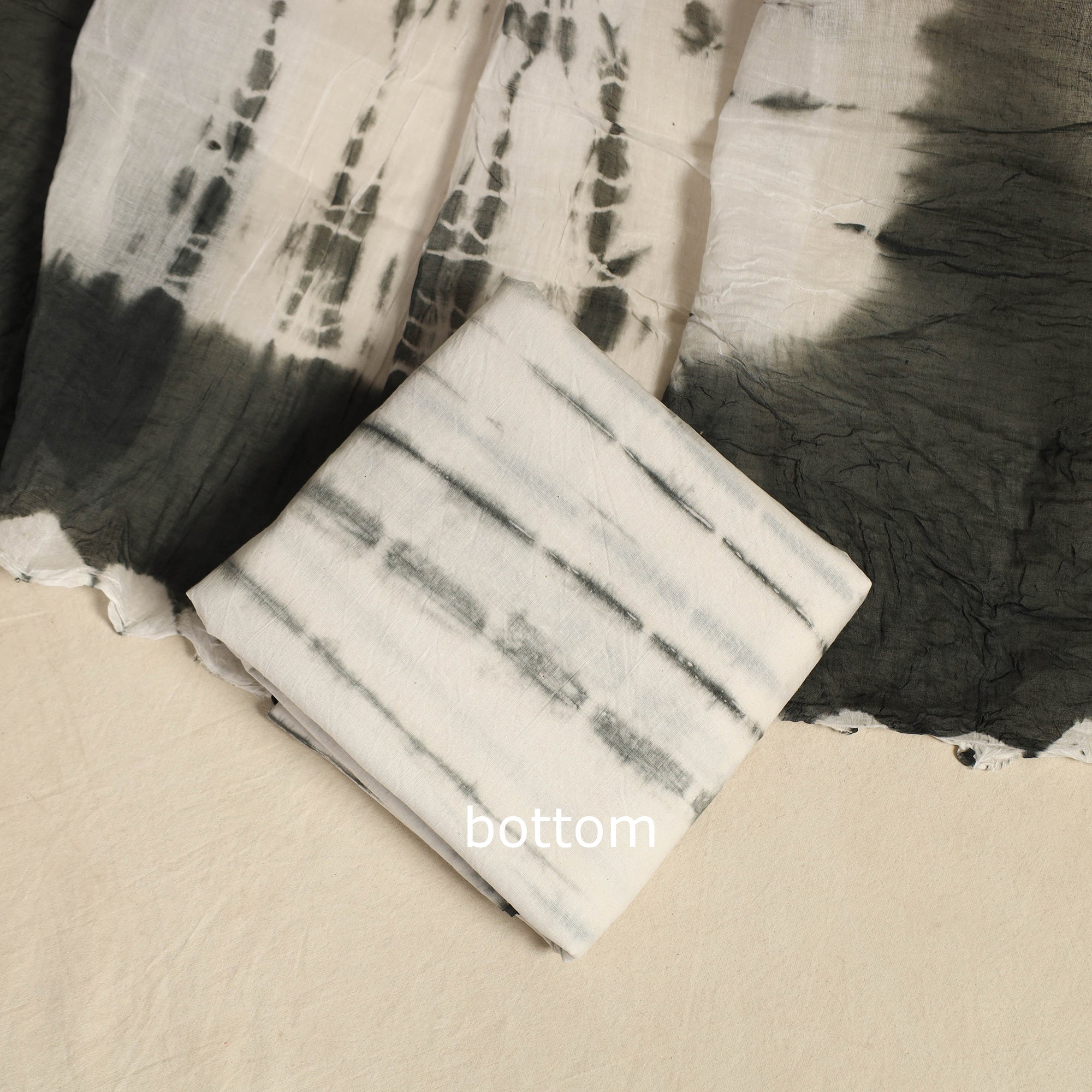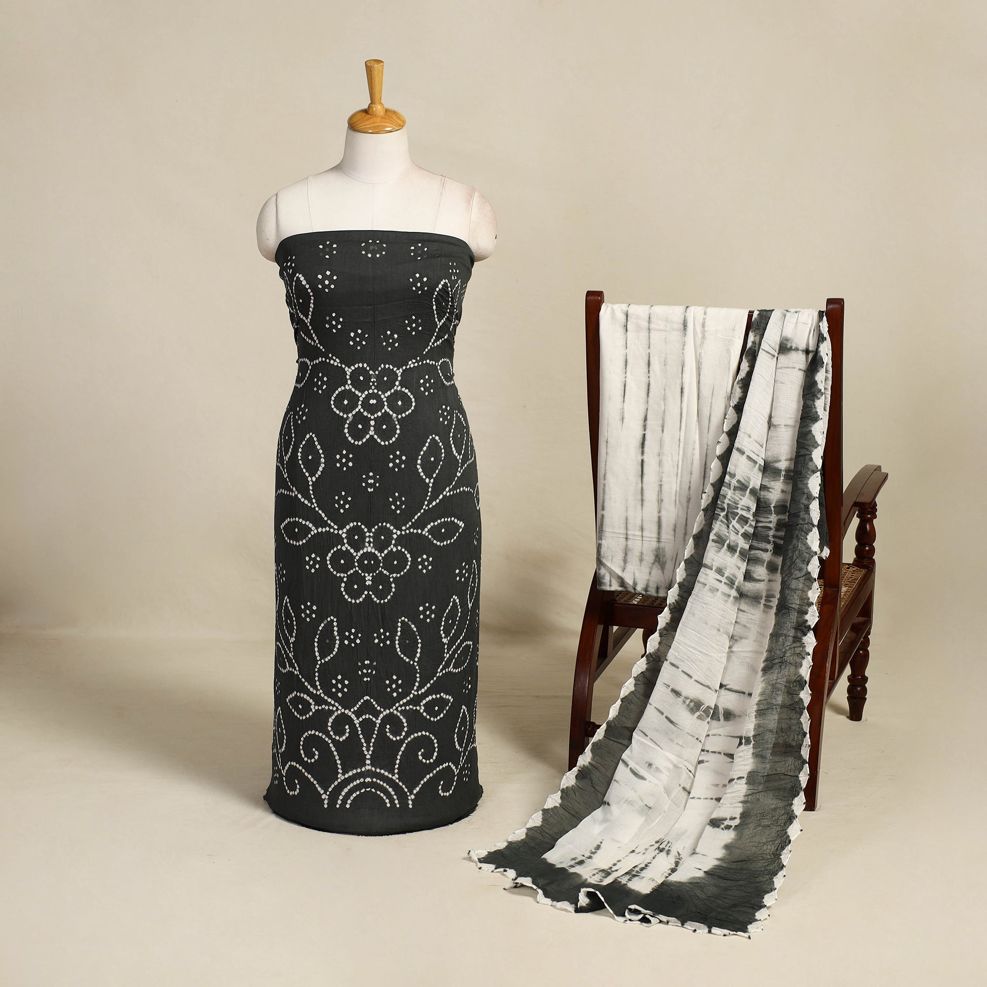 Add a traditional touch to your wardrobe with this grey 3pc tie-dye satin cotton dress material. Crafted by skilled Kutch artisans using traditional techniques, the fabric is precisely tied and dyed at several points to create intricate designs. The set includes a bandhani kurta paired with a shibori bottom material and dupatta. Perfect for festive occasions or everyday elegance.