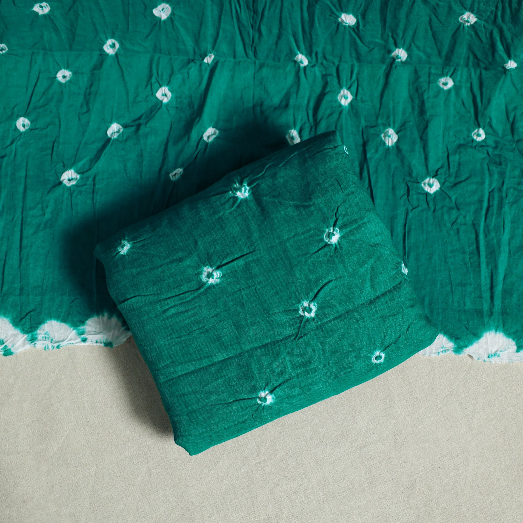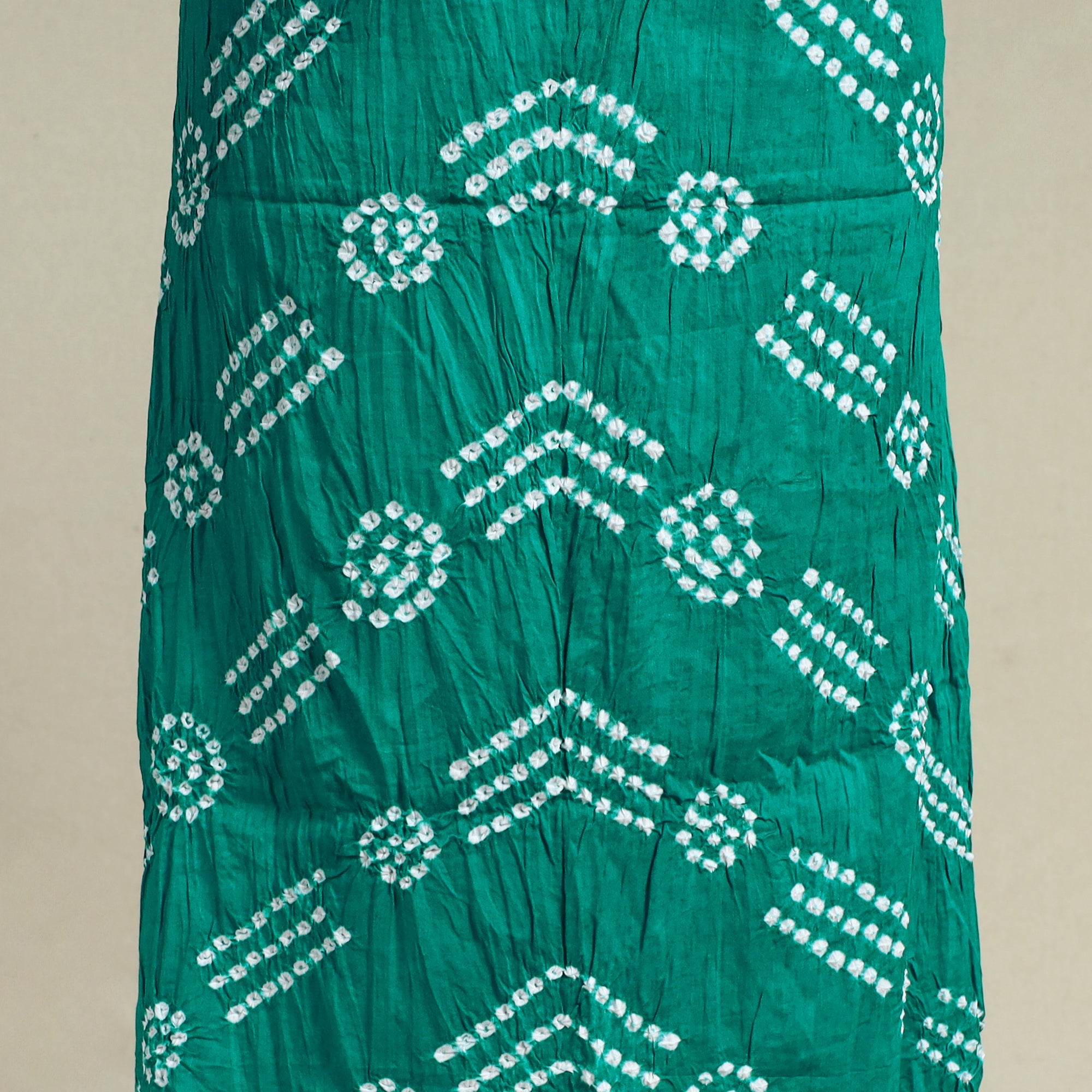 Add a traditional touch to your wardrobe with this green 3pc satin cotton bandhani dress material, crafted using age-old tie-dye techniques. Handcrafted by skilled Kutch artisans, the fabric is carefully tied and dyed at multiple points to form intricate patterns. The set includes a bandhani kurta fabric, a matching dupatta, and a coordinated bottom. Perfect for festive occasions, family functions, or everyday ethnic wear.