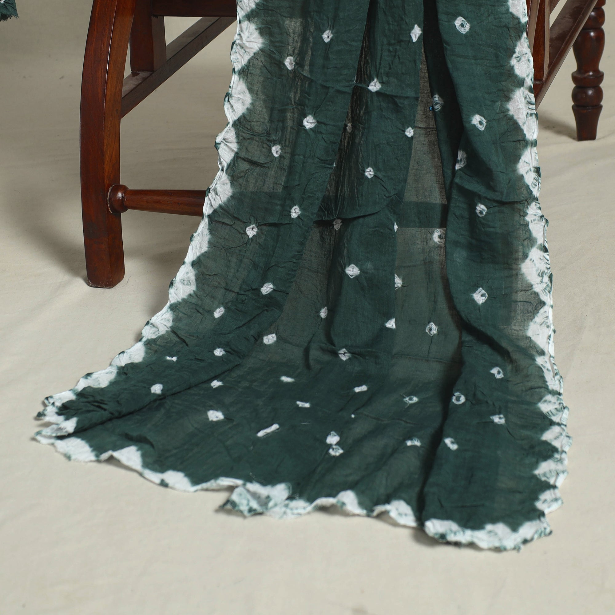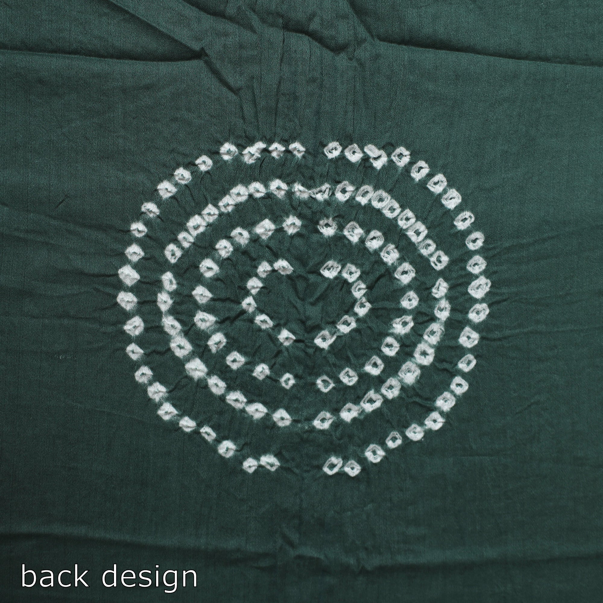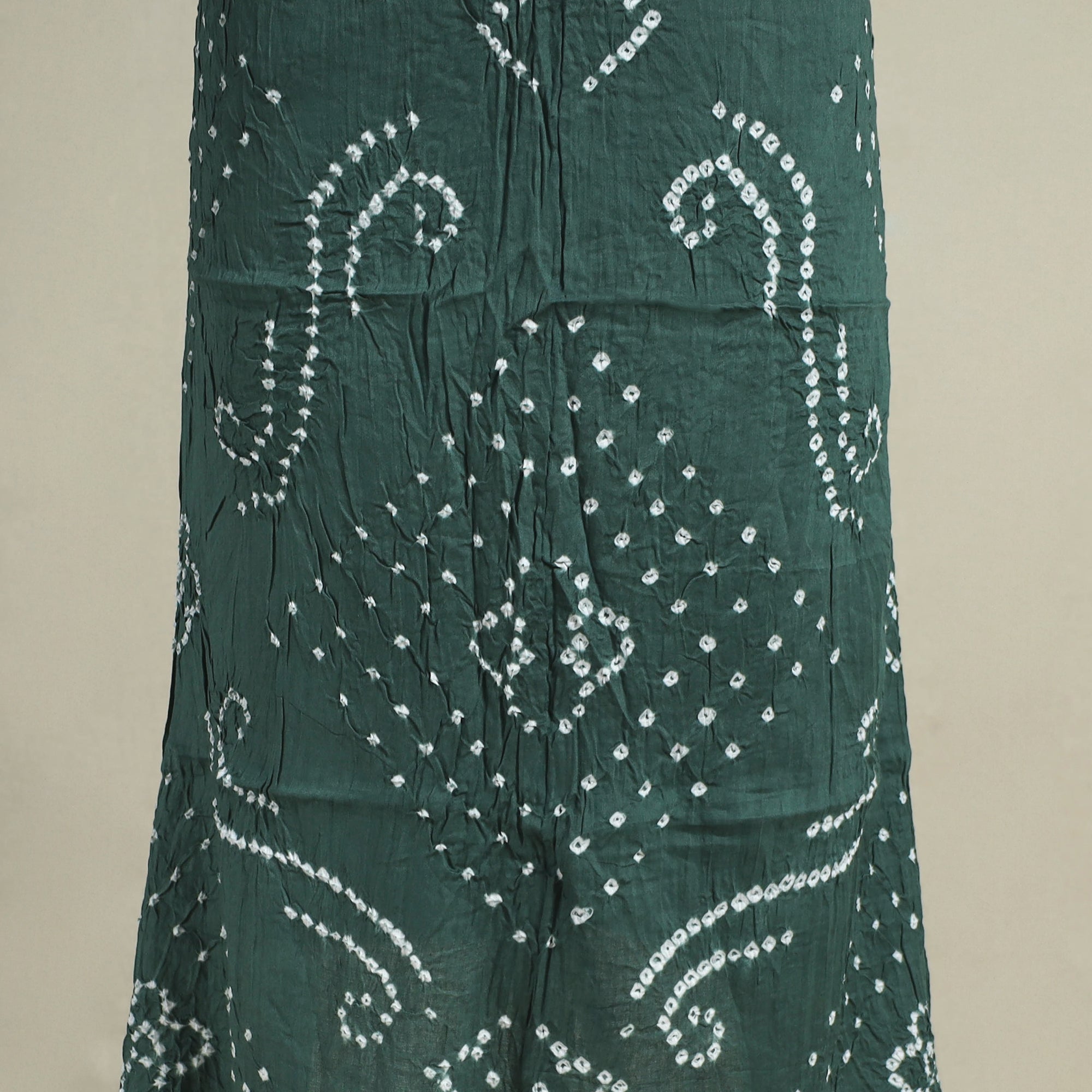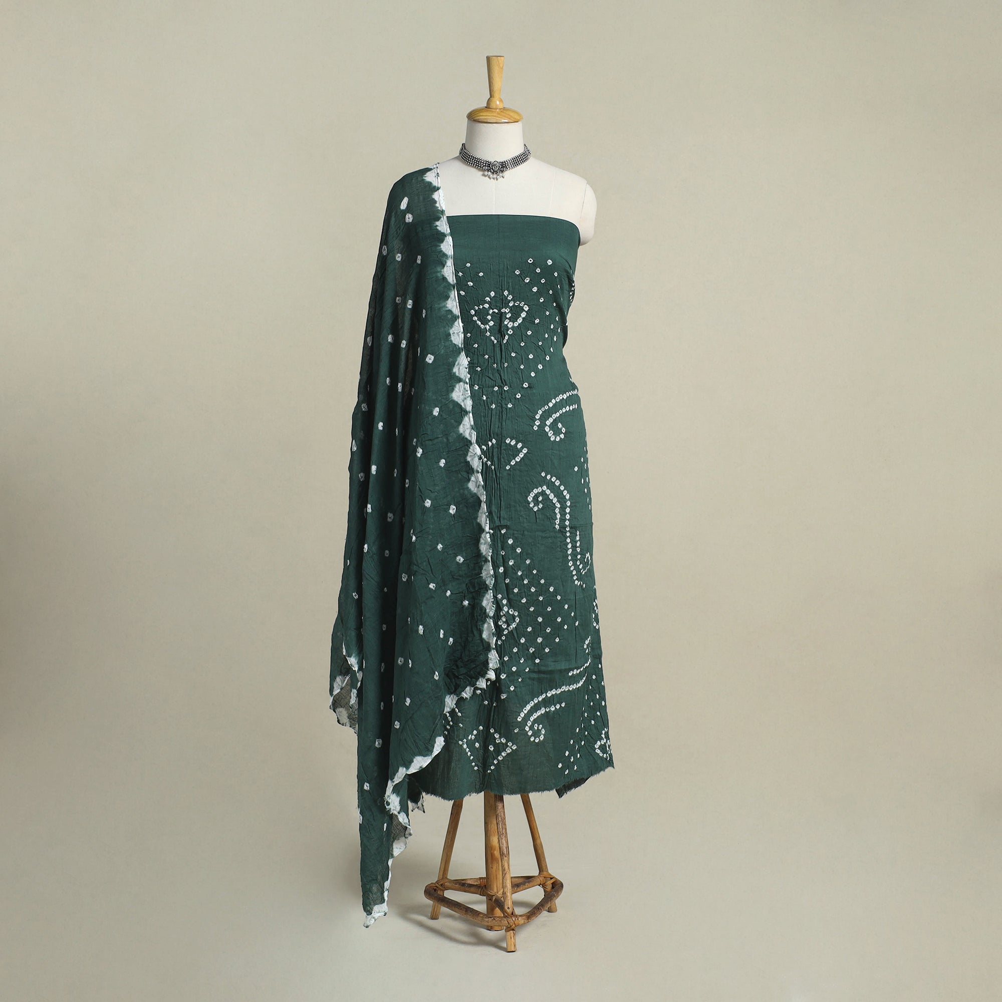 Add a traditional touch to your wardrobe with this green 3pc satin cotton bandhani dress material, crafted using age-old tie-dye techniques. Handcrafted by skilled Kutch artisans, the fabric is carefully tied and dyed at multiple points to form intricate patterns. The set includes a bandhani kurta fabric, a matching dupatta, and a coordinated bottom. Perfect for festive occasions, family functions, or everyday ethnic wear.