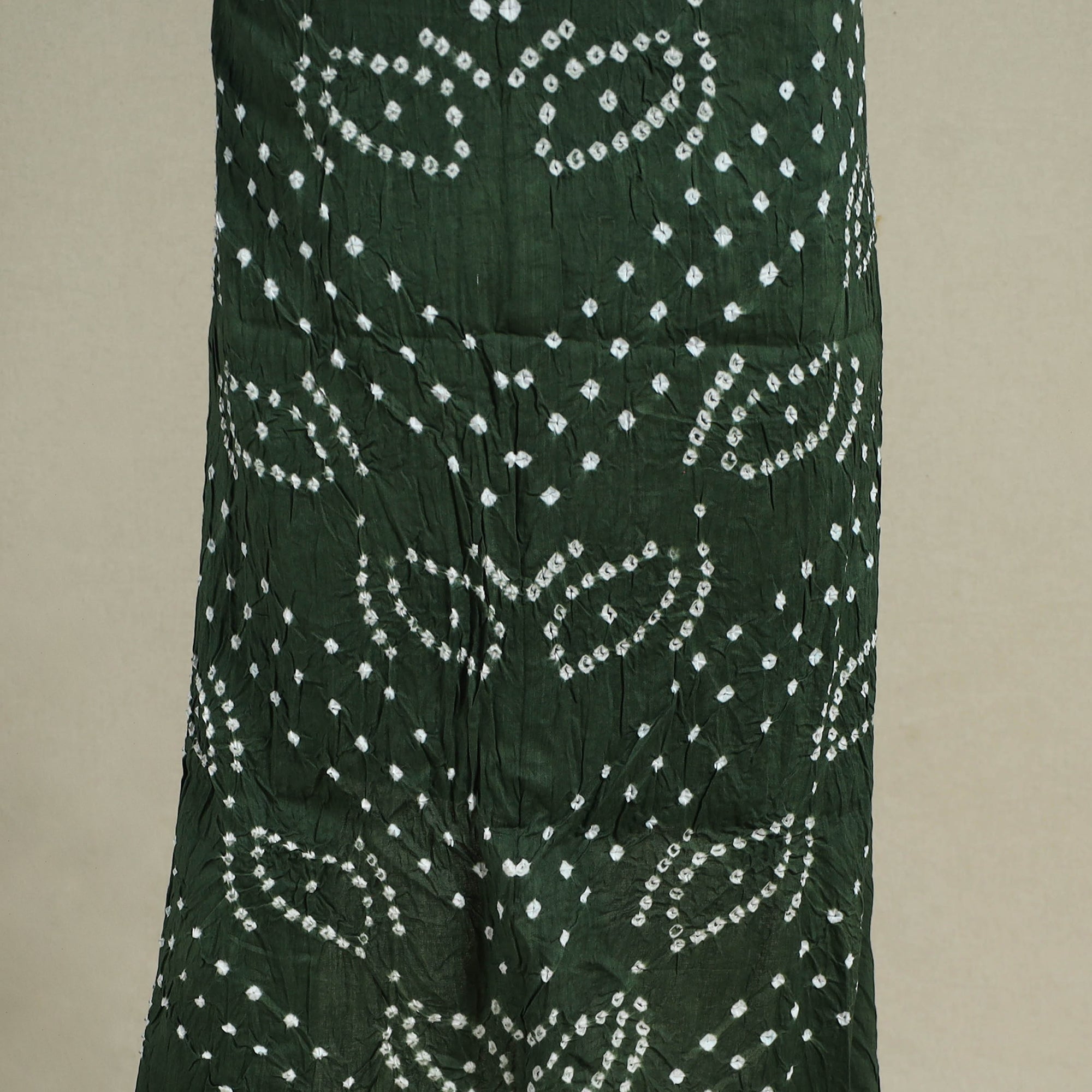 Add a traditional touch to your wardrobe with this green 3pc satin cotton bandhani dress material, crafted using age-old tie-dye techniques. Handcrafted by skilled Kutch artisans, the fabric is carefully tied and dyed at multiple points to form intricate patterns. The set includes a bandhani kurta fabric, a matching dupatta, and a coordinated bottom. Perfect for festive occasions, family functions, or everyday ethnic wear.