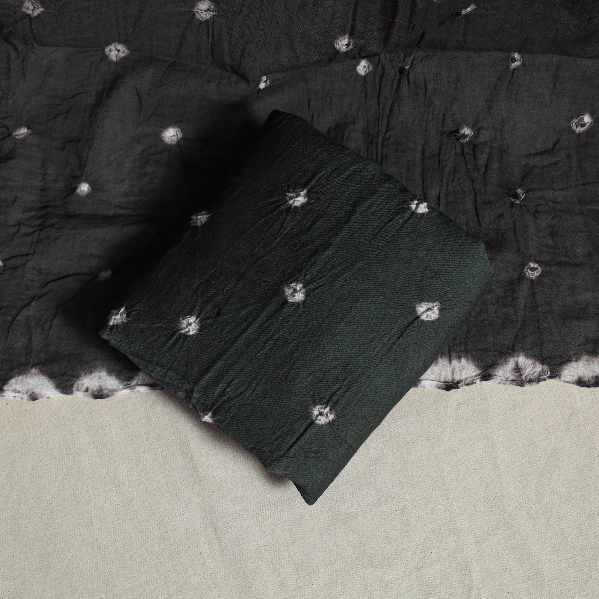 Add a traditional touch to your wardrobe with this black 3pc satin cotton bandhani dress material, crafted using age-old tie-dye techniques. Handcrafted by skilled Kutch artisans, the fabric is carefully tied and dyed at multiple points to form intricate patterns. The set includes a bandhani kurta fabric, a matching dupatta, and a coordinated bottom. Perfect for festive occasions, family functions, or everyday ethnic wear.