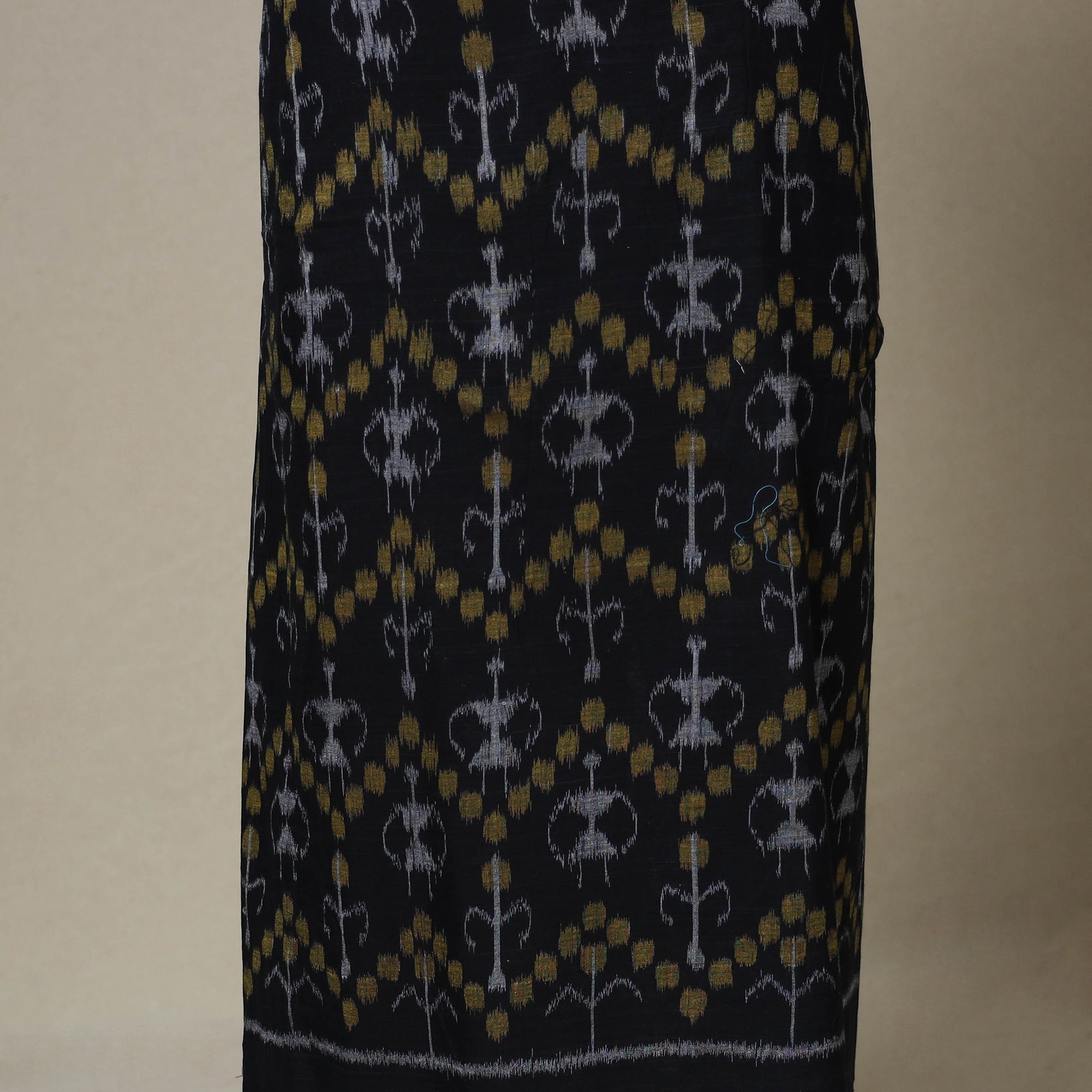 This black 3pc cotton dress material set features a maniabandha Ikat handloom kurta, paired with a plain dupatta and bottom. The kurta is crafted using a traditional resist-dyeing technique, where both warp and weft threads are dyed before weaving to form intricate motifs. The set also includes a matching necklace and earrings, adding a stylish touch to your look. Perfect for festive occasions, weddings, or simply adding elegance to your everyday wardrobe.