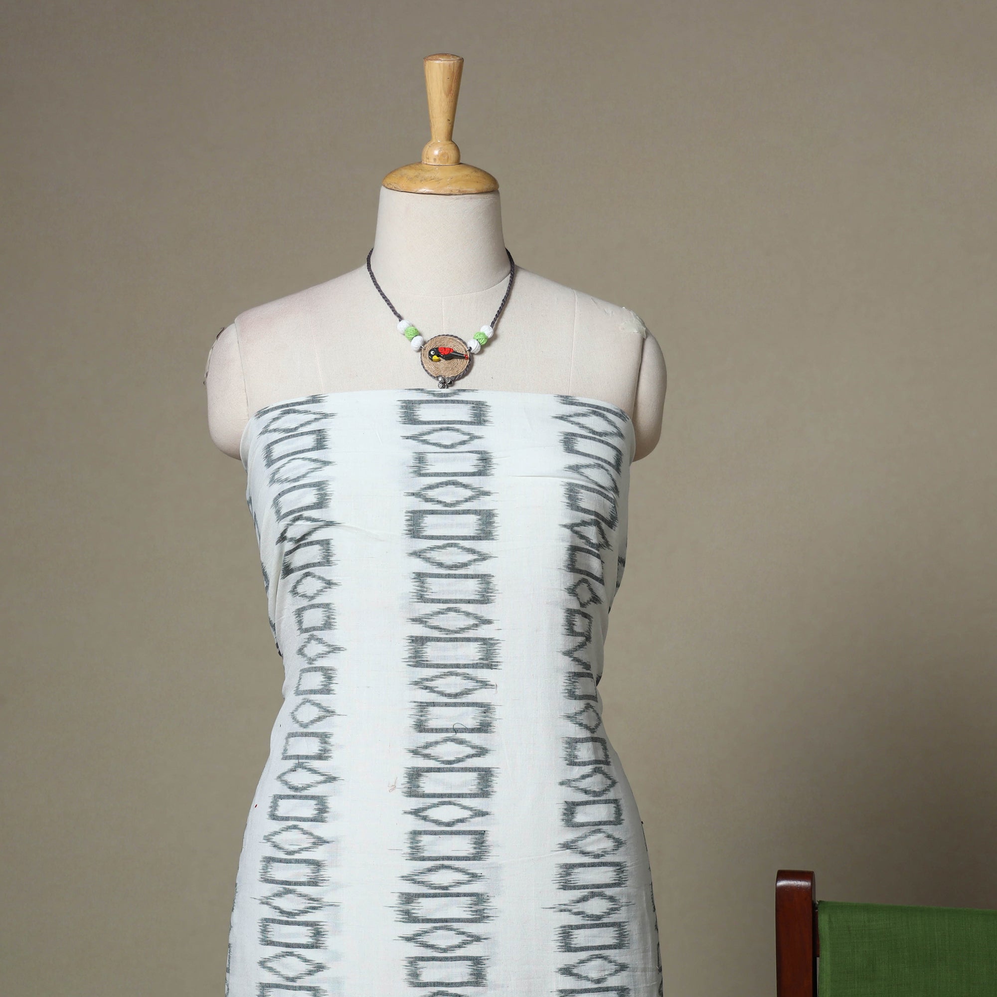 This white 3pc cotton dress material set features a maniabandha Ikat handloom kurta, paired with a plain dupatta and bottom. The kurta is crafted using a traditional resist-dyeing technique, where both warp and weft threads are dyed before weaving to form intricate motifs. The set also includes a matching necklace and earrings, adding a stylish touch to your look. Perfect for festive occasions, weddings, or simply adding elegance to your everyday wardrobe.