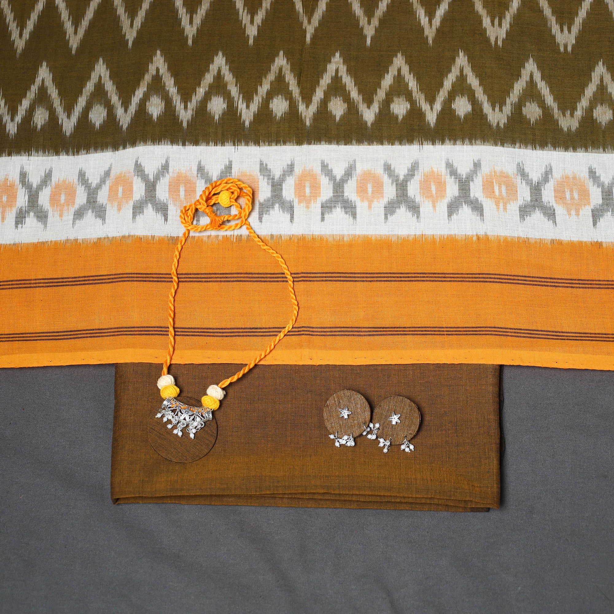 Add a touch of tradition and elegance to your wardrobe with this brown 3pc cotton dress material set. It includes a plain cotton kurta fabric, paired with a pochampally ikat dupatta and a matching slub cotton bottom. The set also comes with a handcrafted necklace and matching earrings to complete your look. Ideal for festive events, family get-togethers, or special occasions.