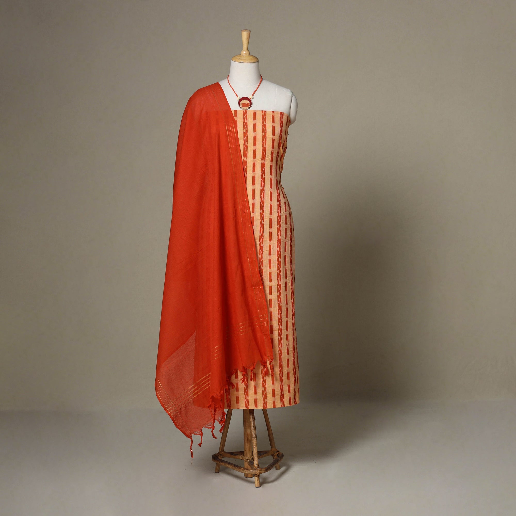 This peach 3pc cotton dress material set features a sambalpuri ikat kurta paired with a plain dupatta and bottom. The kurta is crafted using a traditional resist-dyeing technique, where both warp and weft threads are dyed before weaving to create intricate motifs. The set also includes a matching necklace and earrings, adding a stylish touch to your look. Perfect for festive occasions, weddings, or adding elegance to everyday wear.