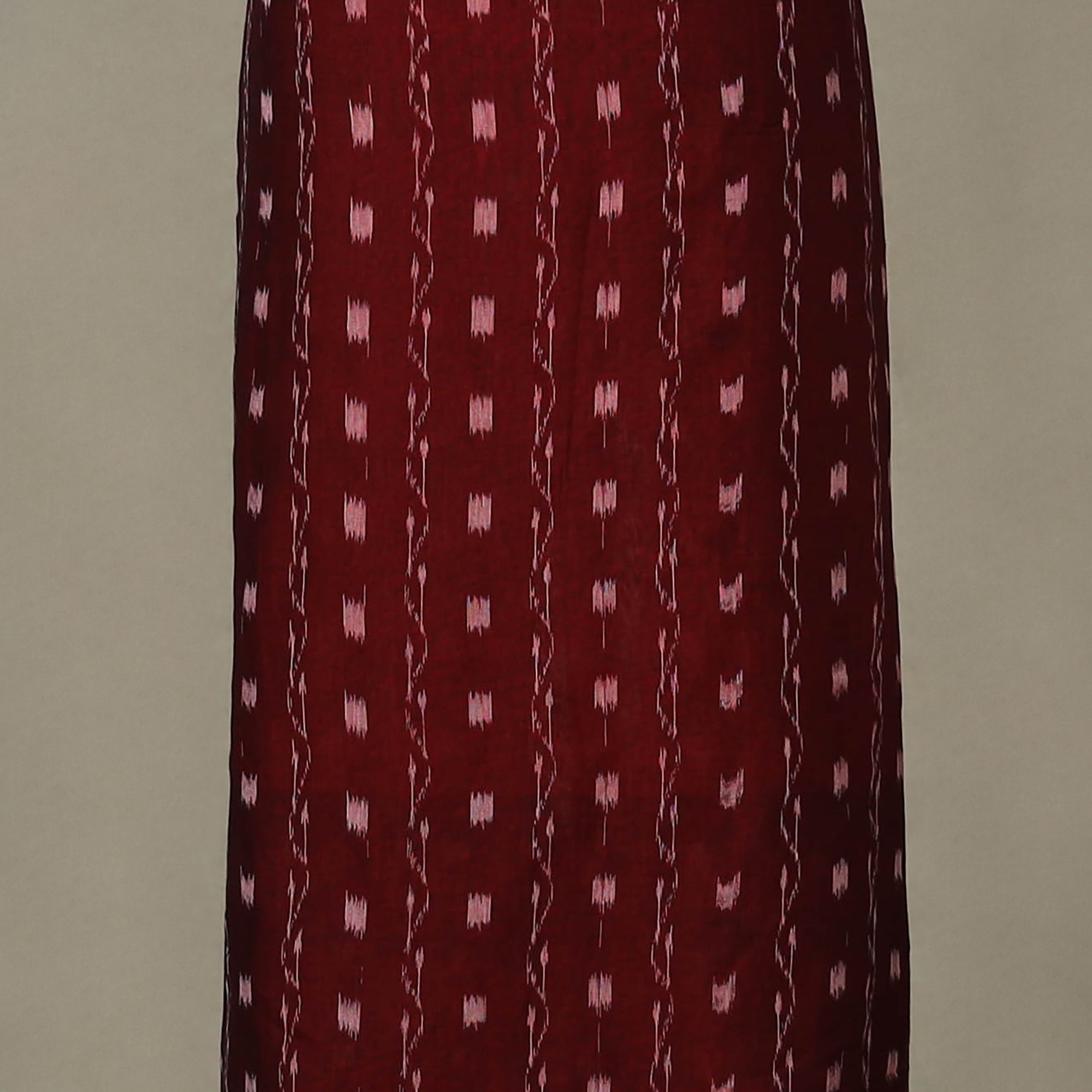 This maroon 3pc cotton dress material set features a sambalpuri ikat kurta paired with a plain dupatta and bottom. The kurta is crafted using a traditional resist-dyeing technique, where both warp and weft threads are dyed before weaving to create intricate motifs. The set also includes a matching necklace and earrings, adding a stylish touch to your look. Perfect for festive occasions, weddings, or adding elegance to everyday wear.