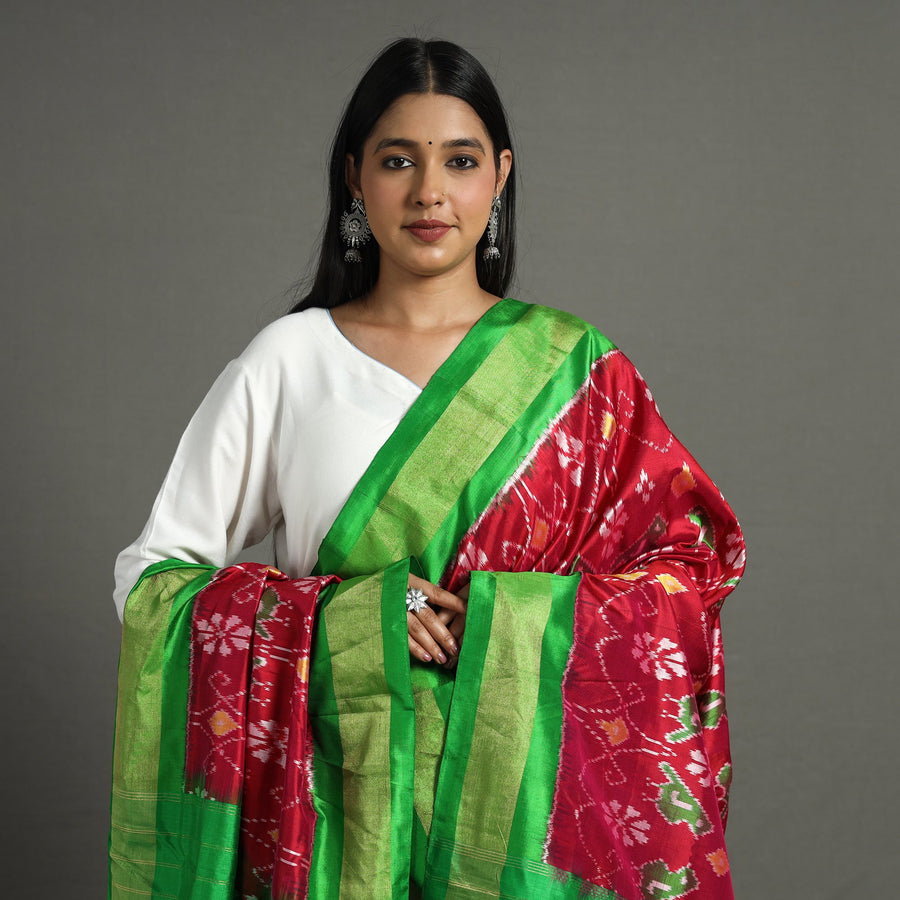 Fine quality pure handspun handloom pochampally ikat pure silk dupatta with zari border from Telangana. Ikat (Ikkat) is a dyeing technique used to pattern textiles that employs a resist dyeing process similar to tie-dye on either the warp or weft fibers prior to dyeing. Ikat has lovely patterns and are world famous for their extremely beautiful colors, texture and designs. Indian Ikat is always admired by the fashion designers around the world.