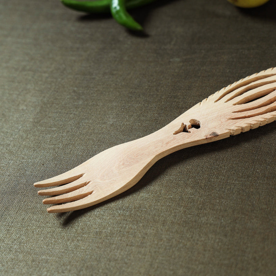 Handcrafted udayagiri beige wooden fork made in Udayagiri town of Nellore district, Andhra Pradesh. Udayagiri cutlery is known for its intricate carvings and fine proportions and is made by a few master craftspersons of the region. This woodcraft continues a tradition that is about 150 years old. Material for making the kitchen items are nardi wood, devadari, bikki chakka and kaldi chakka. The smaller items like spoons, forks and paper knifes by nardi and bikki wood. Bigger spoons and forks are made out of harder wood called kaldi.