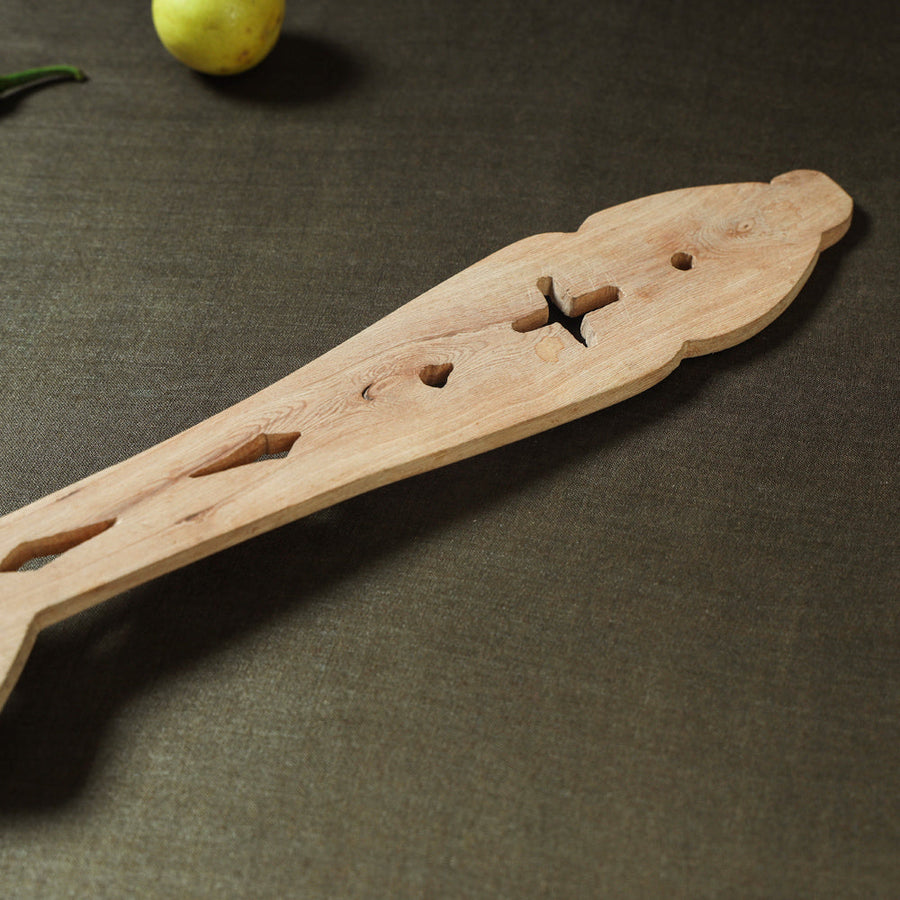 Handcrafted udayagiri wooden serving and cooking spoon made in Udayagiri town of Nellore district, Andhra Pradesh. Udayagiri cutlery is known for its intricate carvings and fine proportions and is made by a few master craftspersons of the region. This woodcraft continues a tradition that is about 150 years old. Material for making the kitchen items are nardi wood, devadari, bikki chakka and kaldi chakka. The smaller items like spoons, forks and paper knifes by nardi and bikki wood. Bigger spoons and forks are made out of harder wood called kaldi.
