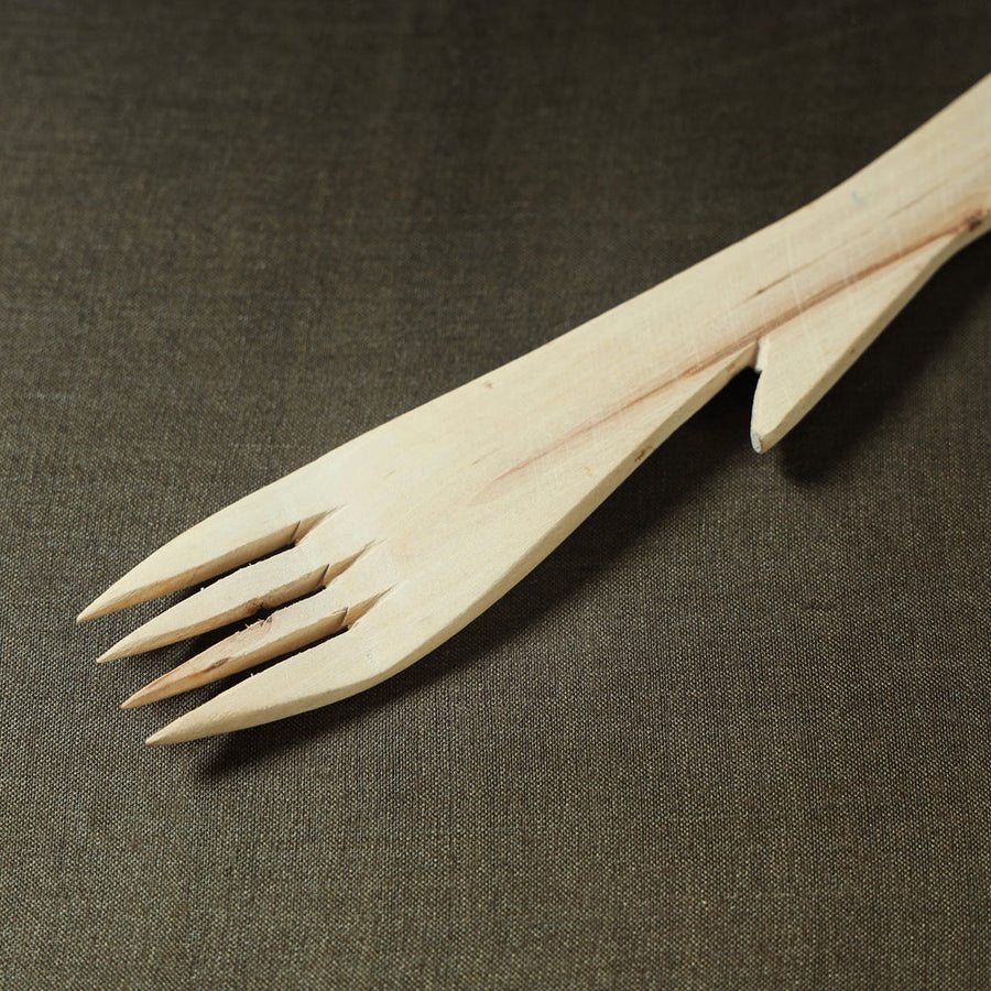 Handcrafted udayagiri beige wooden serving fork made in Udayagiri town of Nellore district, Andhra Pradesh. Udayagiri cutlery is known for its intricate carvings and fine proportions and is made by a few master craftspersons of the region. This woodcraft continues a tradition that is about 150 years old. Material for making the kitchen items are nardi wood, devadari, bikki chakka and kaldi chakka. The smaller items like spoons, forks and paper knifes by nardi and bikki wood. Bigger spoons and forks are made out of harder wood called kaldi.