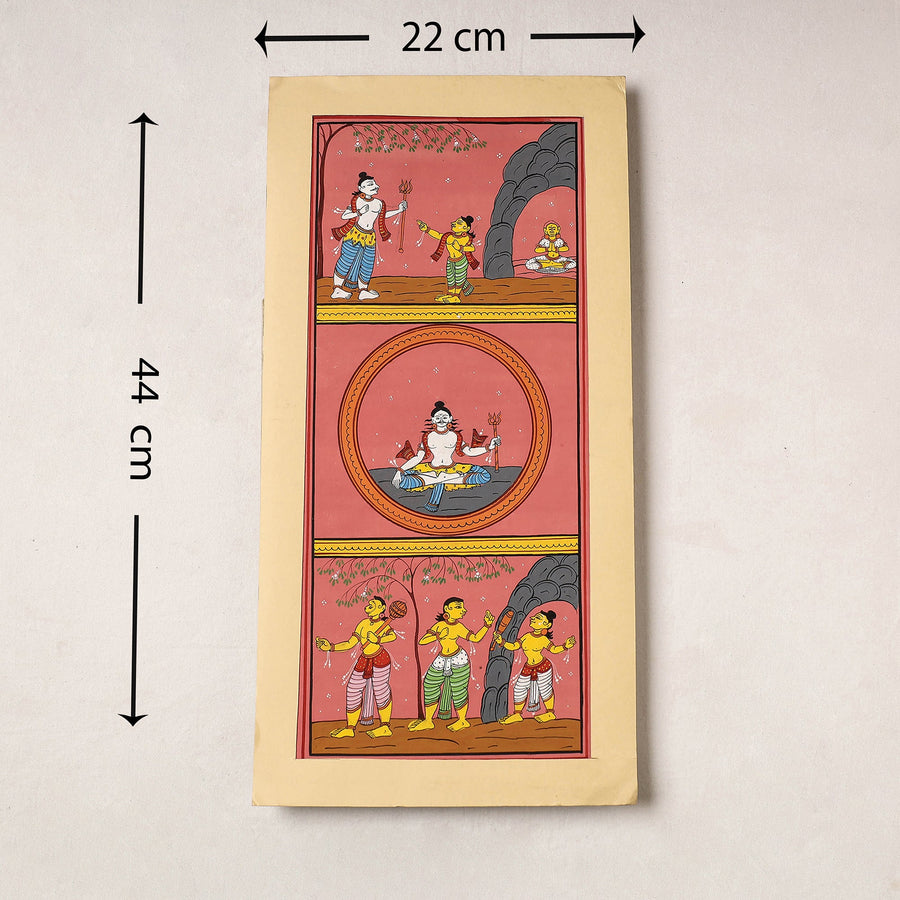 Traditional hand-painted painting with natural colours on handmade paper. Pattachitra or Patachitra is a general term for traditional scroll painting, based in the eastern Indian states of Odisha and West Bengal. Pattachitra artform is known for its intricate details as well as mythological narratives and folktales inscribed in it. Pattachitra is one of the ancient artworks of Odisha. Patrachitras are a component of an ancient Bengali narrative art, originally serving as a visual device during the performance of a song. This classical Pattachitra art comes from Danda Sahi, Balia, Odisha from the family of Dilip Kumar. A wonderful painting for the discerning decor aficionado or gift for an art lover. These are priceless collectibles.