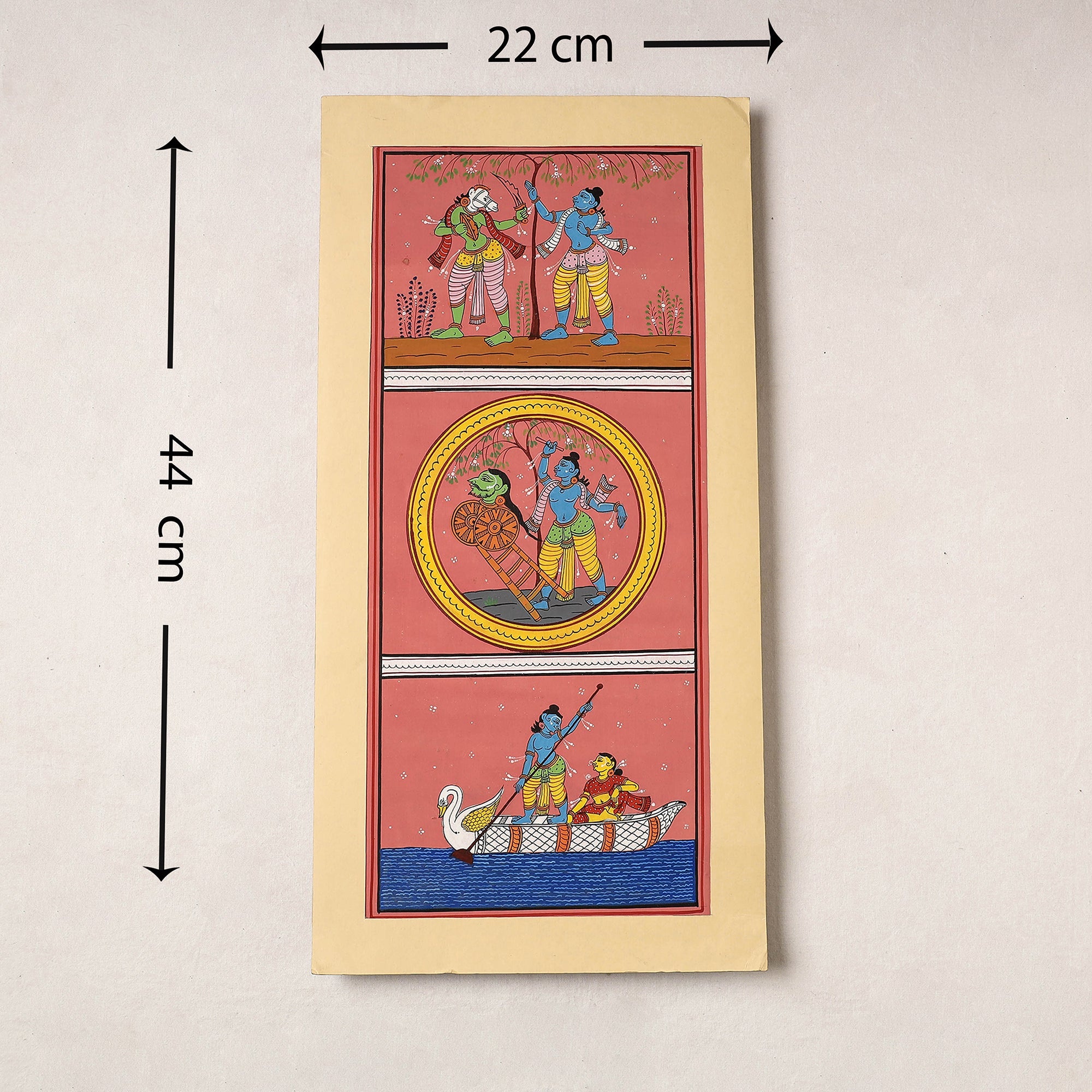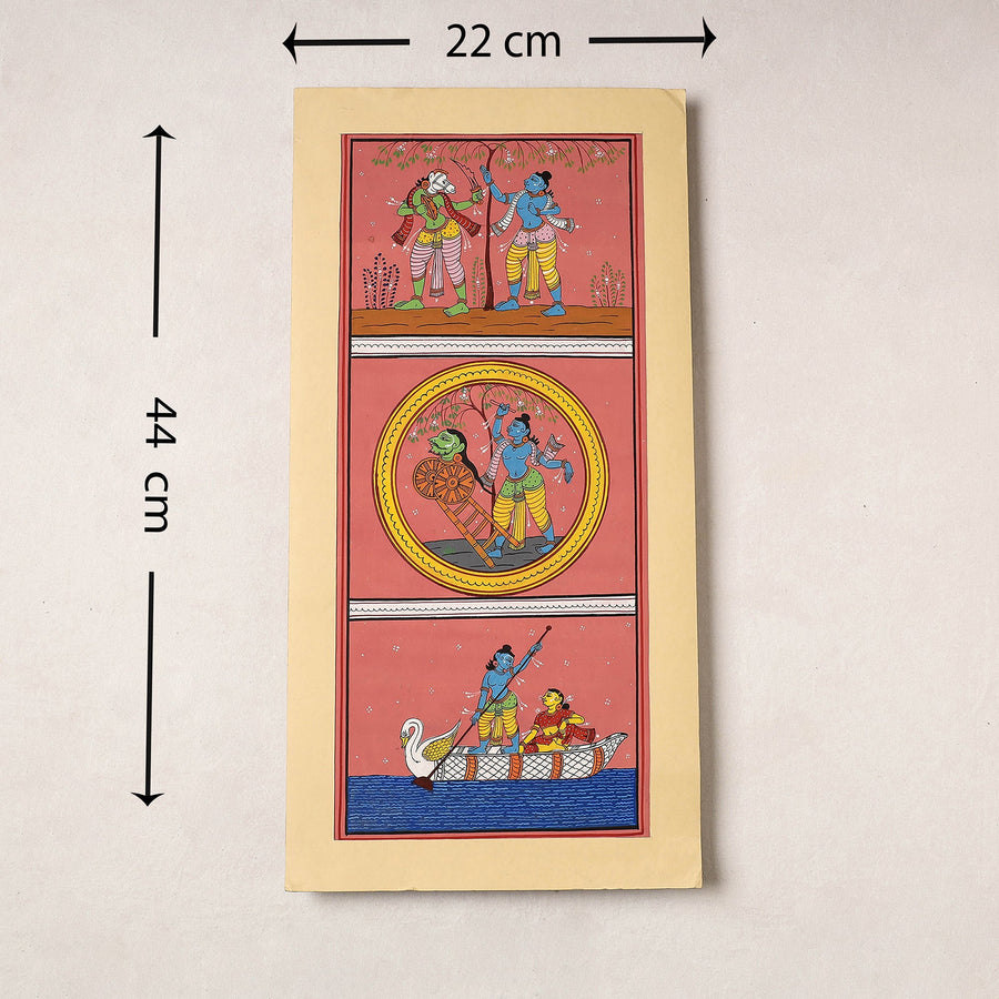 Traditional hand-painted painting with natural colours on handmade paper. Pattachitra or Patachitra is a general term for traditional scroll painting, based in the eastern Indian states of Odisha and West Bengal. Pattachitra artform is known for its intricate details as well as mythological narratives and folktales inscribed in it. Pattachitra is one of the ancient artworks of Odisha. Patrachitras are a component of an ancient Bengali narrative art, originally serving as a visual device during the performance of a song. This classical Pattachitra art comes from Danda Sahi, Balia, Odisha from the family of Dilip Kumar. A wonderful painting for the discerning decor aficionado or gift for an art lover. These are priceless collectibles.