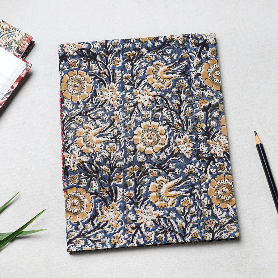 | Material | Kalamkari block print fabric embellished soft bound cover notebook with handmade papers. This paper is made of cotton, paper and other natural fibre waste recycled in an eco-friendly manner without the use of chemicals. Hand made by master artisans who maintain careful personal attention to detail. They are highly skilled in a variety of bookbinding and handmade stationery manufacturing techniques. |
