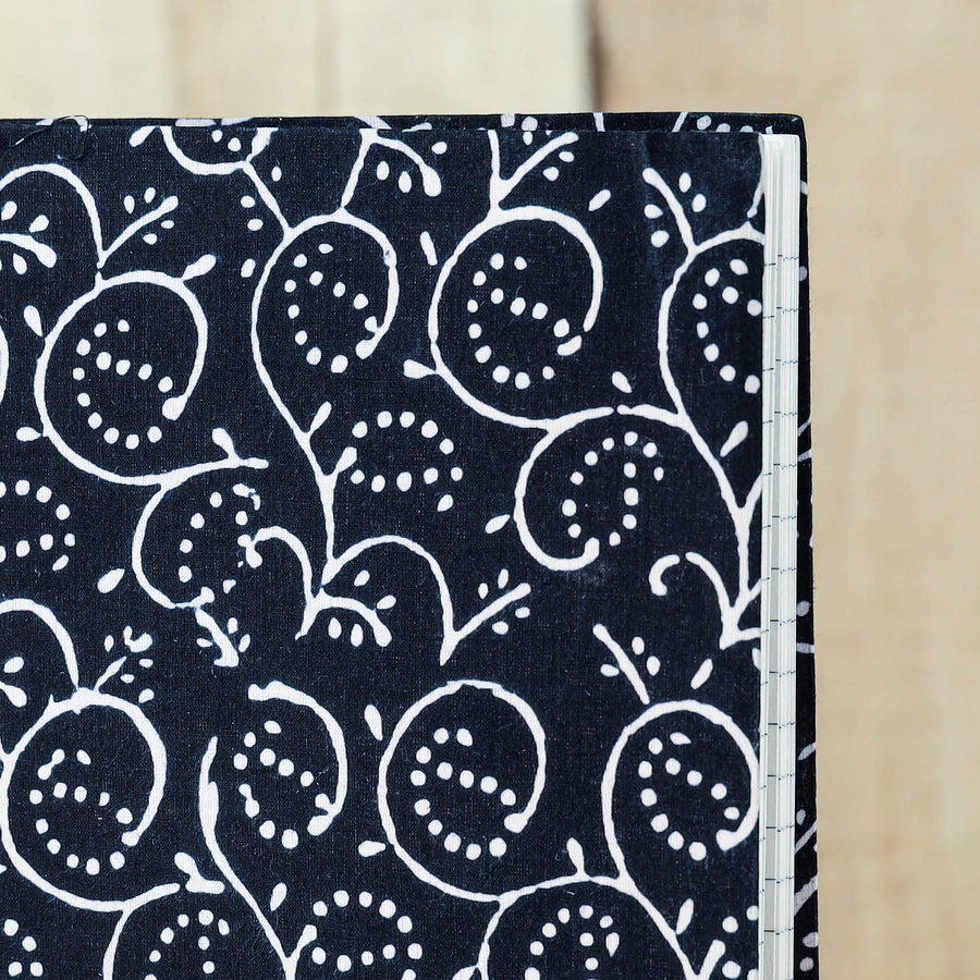 Black sanganeri block printed fabric embellished hard bound cover notebook with hand made papers. This paper is made of cotton, paper and other natural fibre waste recycled in an eco-friendly manner without the use of chemicals. Hand made by master artisans who maintain careful personal attention to detail. They are highly skilled in a variety of bookbinding and handmade stationery manufacturing techniques.