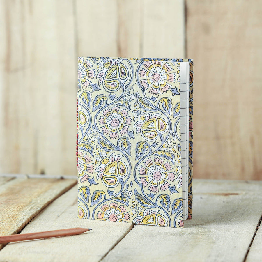 | Material | Beige sanganeri block printed fabric embellished hard bound cover notebook with hand made papers. This paper is made of cotton, paper and other natural fibre waste recycled in an eco-friendly manner without the use of chemicals. Hand made by master artisans who maintain careful personal attention to detail. They are highly skilled in a variety of bookbinding and handmade stationery manufacturing techniques. |