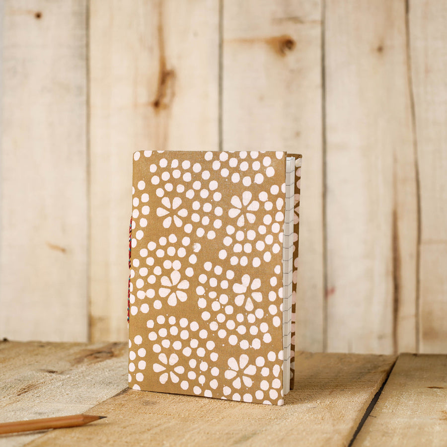 | Material | Brown batik printed fabric embellished hard bound cover notebook with handmade papers. This paper is made of cotton, paper and other natural fibre waste recycled in an eco-friendly manner without the use of chemicals. Hand made by master artisans who maintain careful personal attention to detail. They are highly skilled in a variety of bookbinding and handmade stationery manufacturing techniques. |