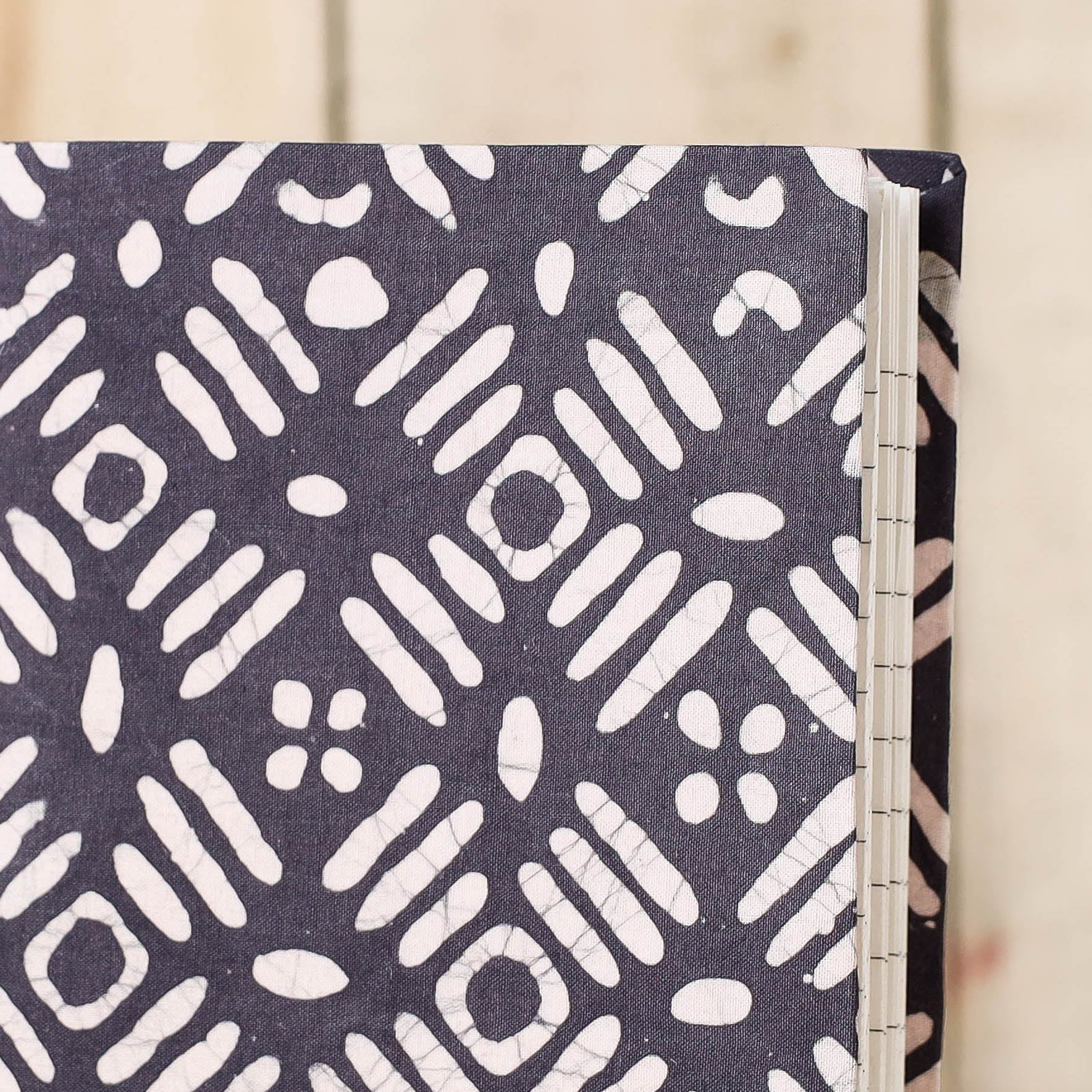 | Material | Grey batik printed fabric embellished hard bound cover notebook with handmade papers. This paper is made of cotton, paper and other natural fibre waste recycled in an eco-friendly manner without the use of chemicals. Hand made by master artisans who maintain careful personal attention to detail. They are highly skilled in a variety of bookbinding and handmade stationery manufacturing techniques. |