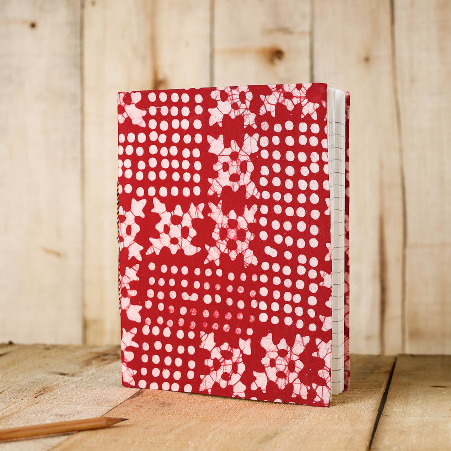| Material | Red batik printed fabric embellished hard bound cover notebook with handmade papers. This paper is made of cotton, paper and other natural fibre waste recycled in an eco-friendly manner without the use of chemicals. Hand made by master artisans who maintain careful personal attention to detail. They are highly skilled in a variety of bookbinding and handmade stationery manufacturing techniques. |
