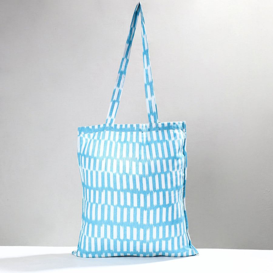 Blue handcrafted pochampally ikat cotton fabric shopping bag. It has ample space to keep most of your essentials. Ikat has lovely patterns in extremely beautiful colours and are world famous for their colours, texture and designs. Fine quality bags textured with handmade textiles of India.