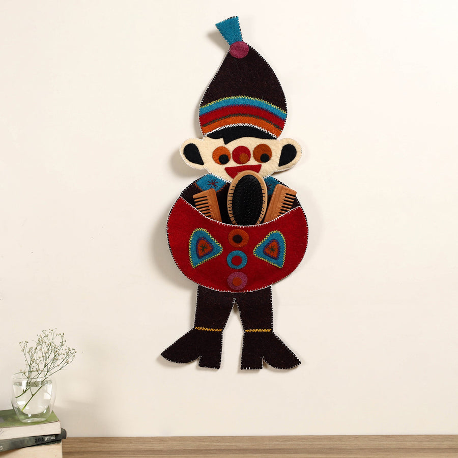 | Material | Hand felted pure wool namda wall hanging made from original sheep wool. It has one pocket. This hanging is handmade using Namda process, a rare and unique craft originating in the Mughal era, wherein splendid floor pieces are made from 100% sheep wool (white or dyed) by practice of felting the wool rather than weaving it. This art is quite popular in Jammu & Kashmir, Himachal Pradesh and Rajasthan. Namda is made by felting of wool rather than weaving it. Wool is spread evenly in a thick layer on a grass mat or jute mat and sprinkled generously with soap water. The mat is then rolled tightly and tied up with a rope and compressed by way of rolling to-and-fro on the floor with the help of hands and feet for about an hour which allows fusing together of the fibre technically known as 'fibre to fibre' fusion. The rope is then untied, and the mat unrolled to discover the well-shaped Namda. |