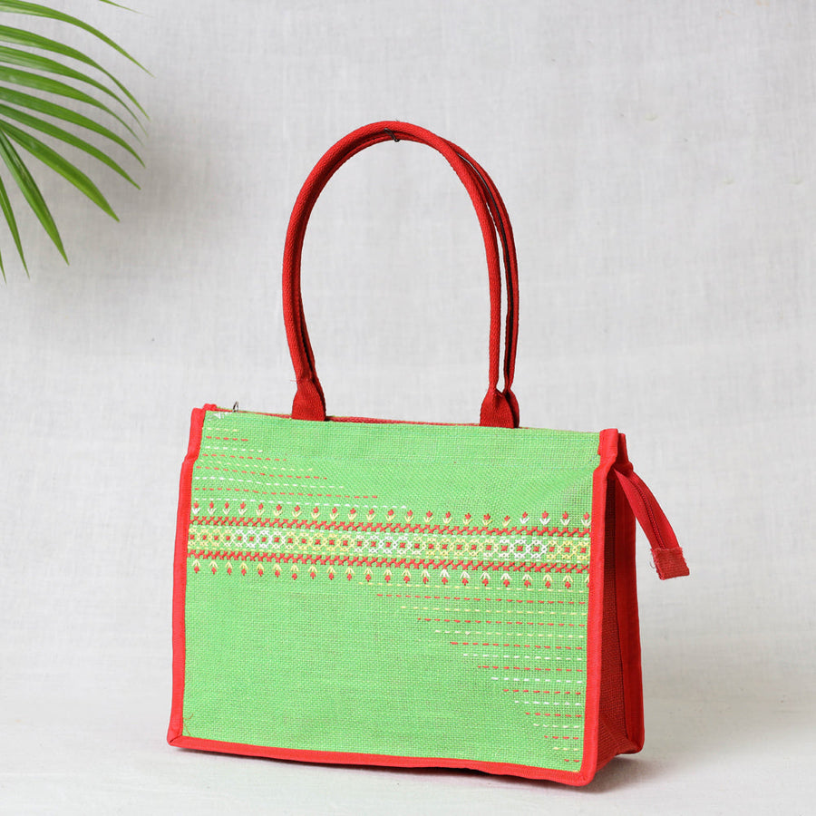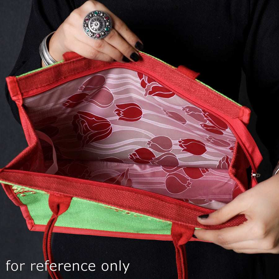 Green tribal design hand embroidered multipurpose jute hand bag/lunch bag. It has ample space to keep most of your essentials made from jute & spill-proof plastic layer lining inside. Fine quality hand embroidered by the women of Namrata Primary (Kamli) | Rajasthan Vanvasi Kalyan Parishad from Udaipur.