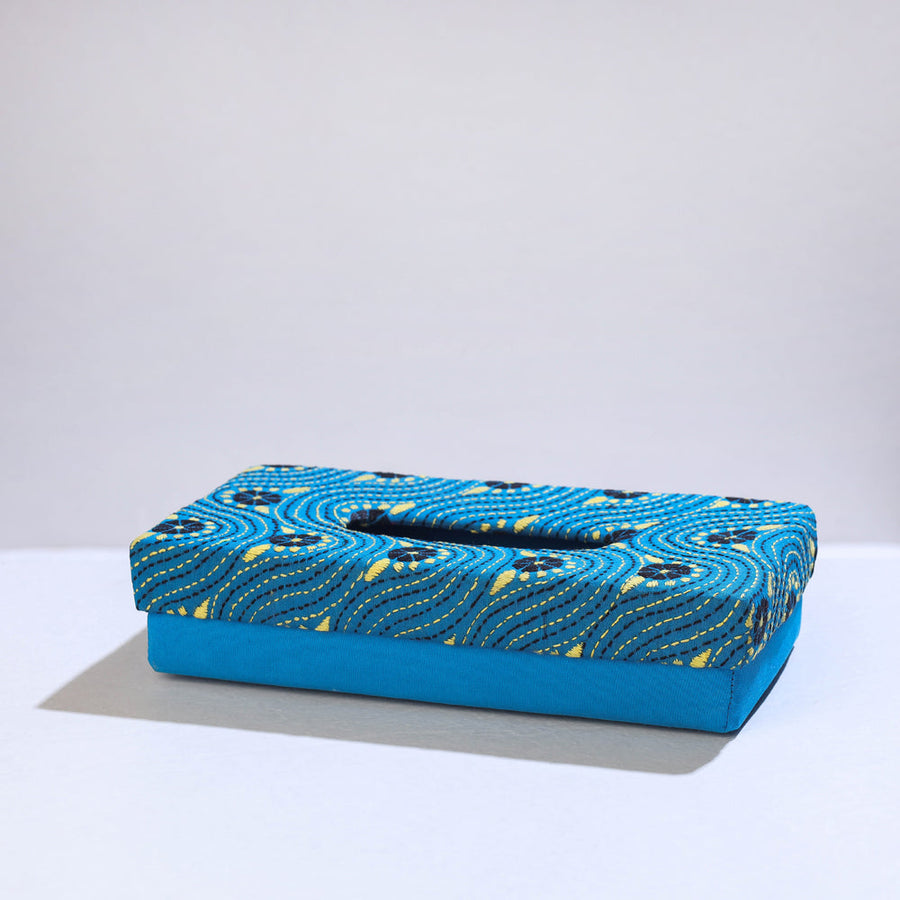 Fine quality blue handcrafted kantha work tissue box from West Bengal. Made from hardboard, the box is lined with hand kantha work fabric. This tissue box is a beautiful and decorative box especially made for keeping tissues and paper napkins. Long lasting & sturdy material.