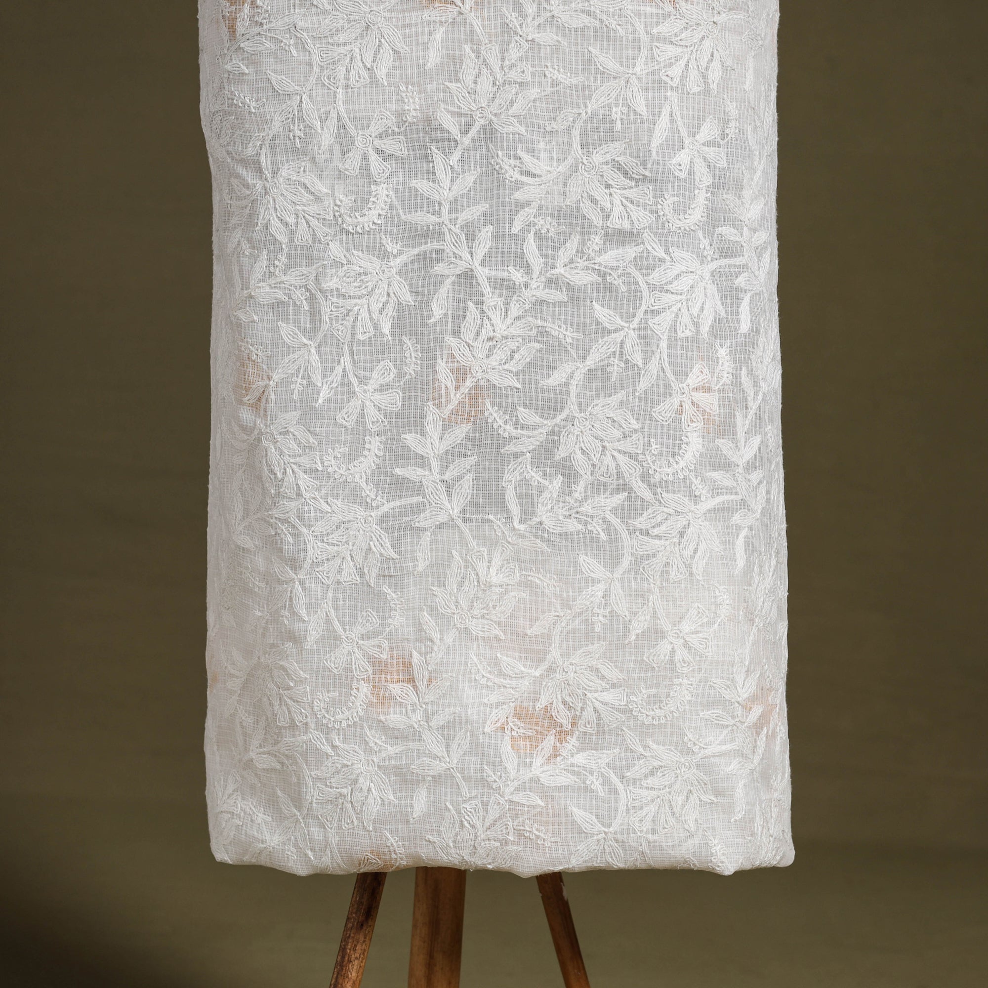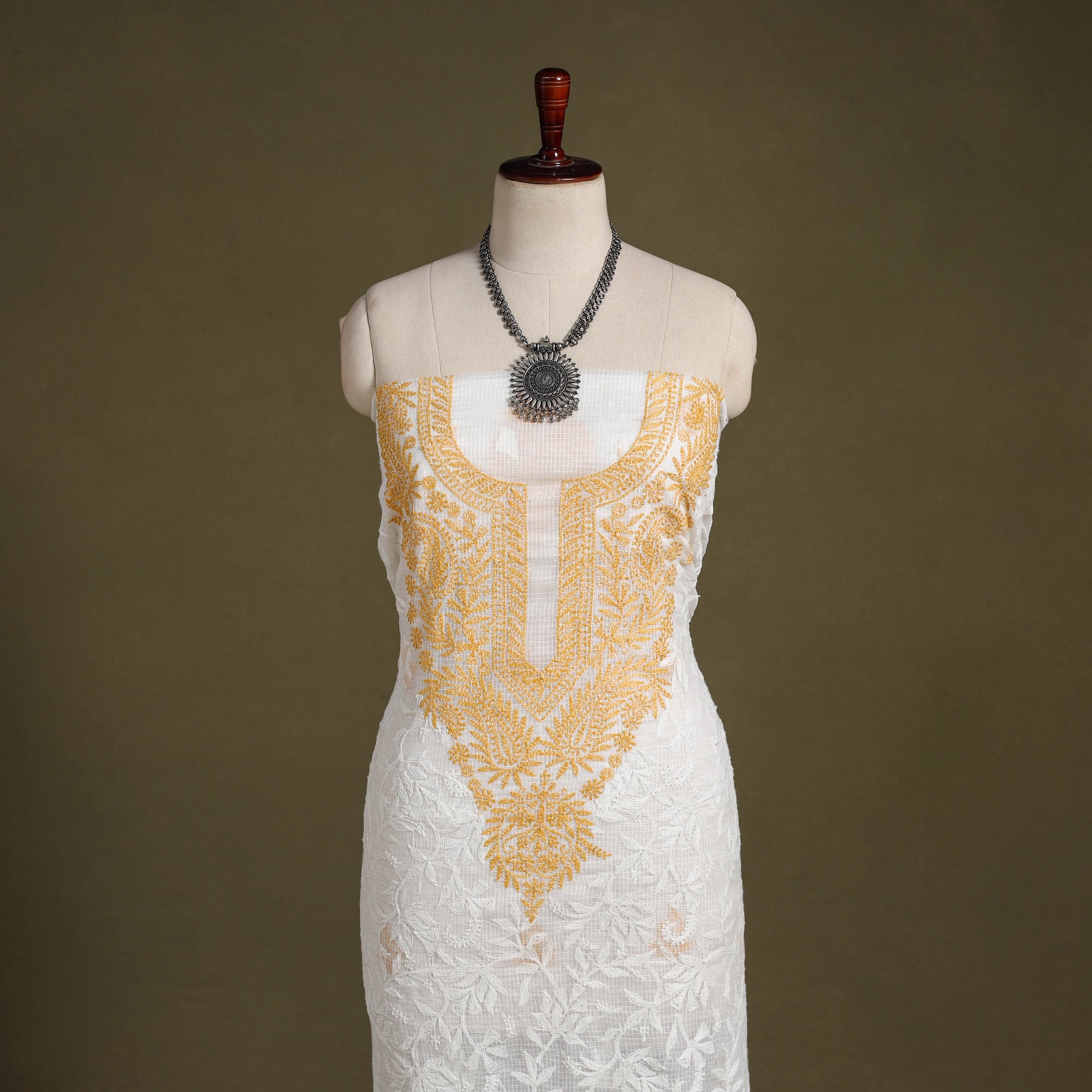 Intricate and artfully done white lucknowi chikankari tepchi hand embroidered kota doria cotton kurta material. Chikankari is a traditional textile decorative from Lucknow. It is very delicate and intricate hand embroidery work where thread is embroidered on cool, pastel shades of light cotton garments.