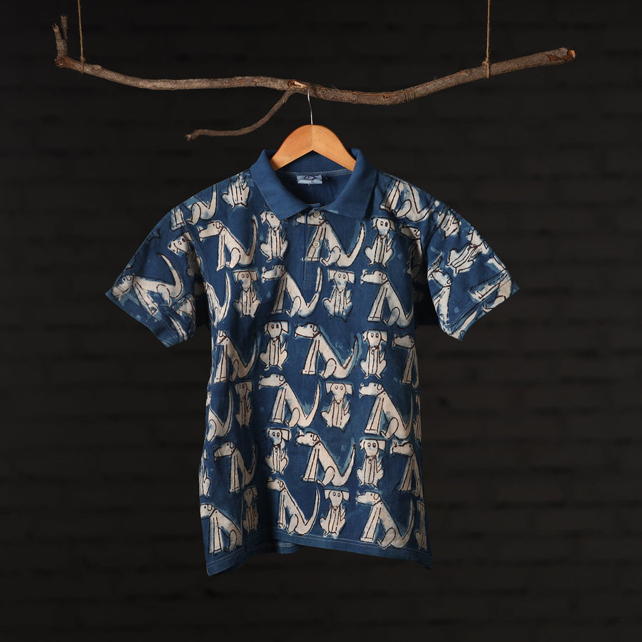 Fine quality pure cotton natural dyed special hand block printed unisex polo collar half sleeve t-shirt. Contemporary designs made through traditional processes, by skilled fourth generation textile printers in Rajasthan. This slow fashion, hand block printed cotton shirt brings back the love for traditional skills, with a modern aesthetic and design.