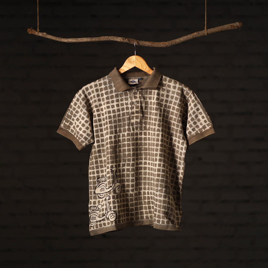 Fine quality pure cotton natural dyed special hand block printed unisex polo collar half sleeve t-shirt. Contemporary designs made through traditional processes, by skilled fourth generation textile printers in Rajasthan. This slow fashion, hand block printed cotton shirt brings back the love for traditional skills, with a modern aesthetic and design.