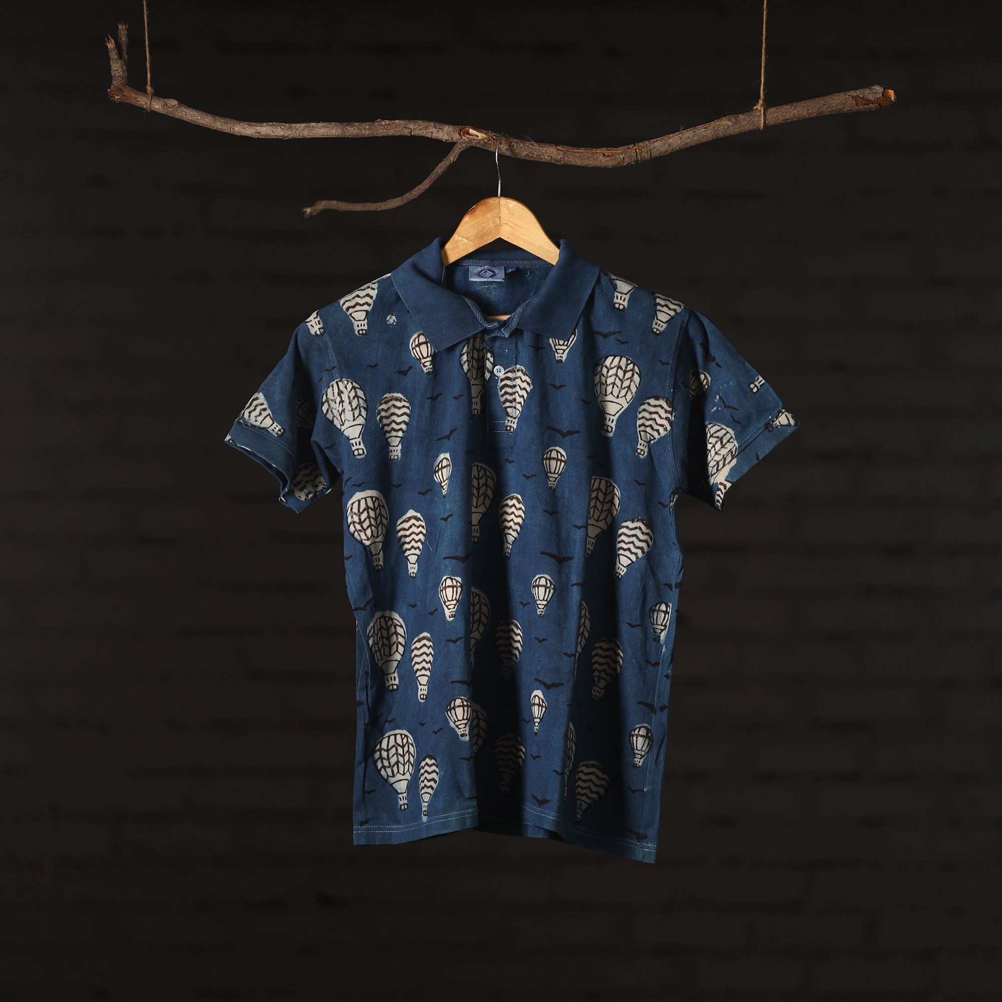 Fine quality pure cotton natural dyed special hand block printed unisex polo collar half sleeve t-shirt. Contemporary designs made through traditional processes, by skilled fourth generation textile printers in Rajasthan. This slow fashion, hand block printed cotton shirt brings back the love for traditional skills, with a modern aesthetic and design.