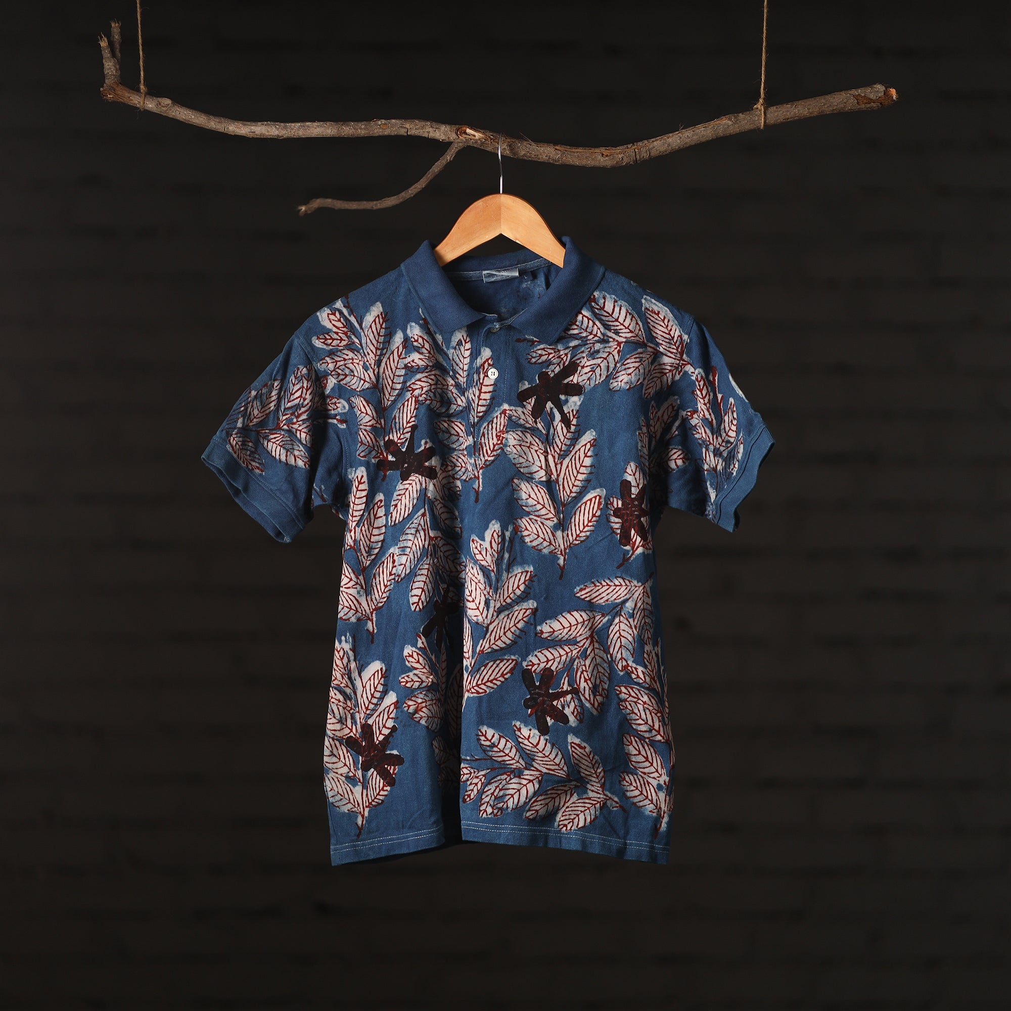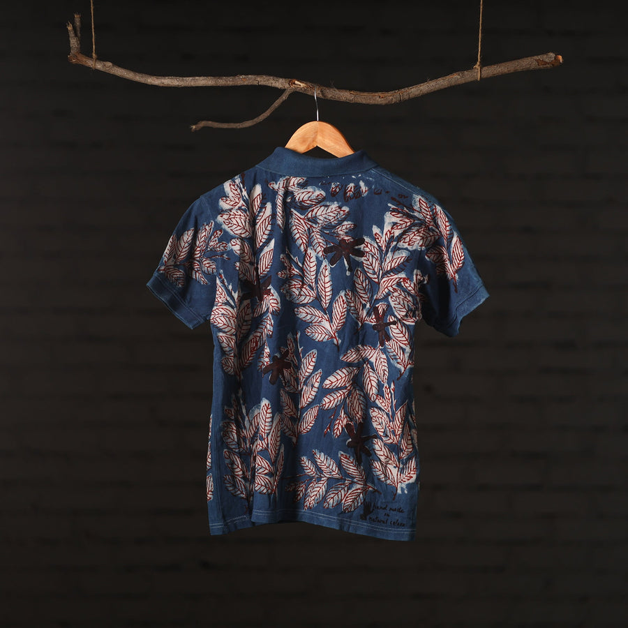 Fine quality pure cotton natural dyed special hand block printed unisex polo collar half sleeve t-shirt. Contemporary designs made through traditional processes, by skilled fourth generation textile printers in Rajasthan. This slow fashion, hand block printed cotton shirt brings back the love for traditional skills, with a modern aesthetic and design.