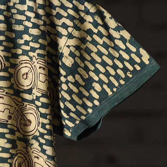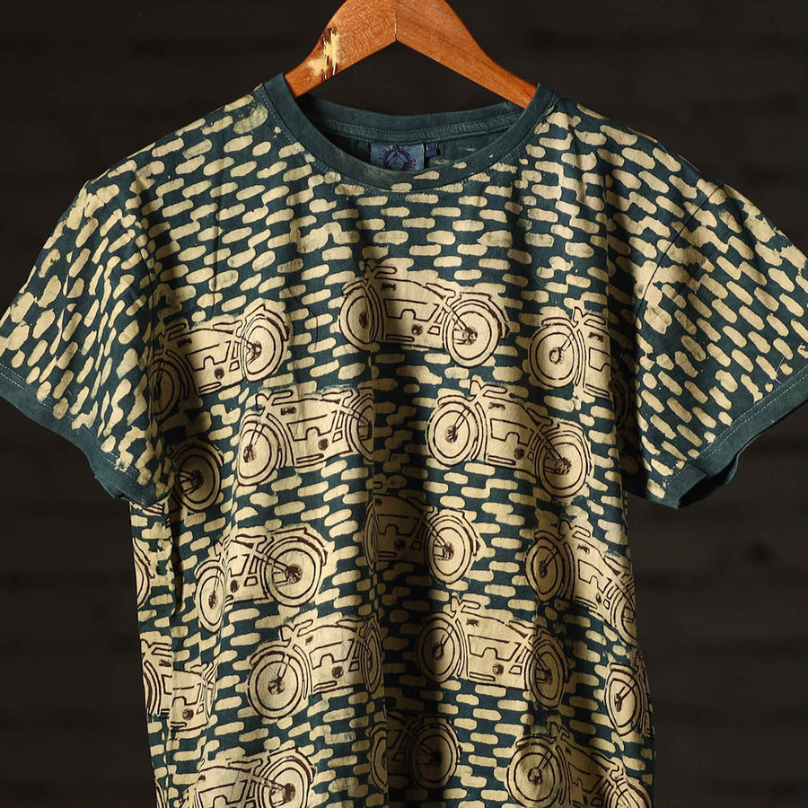 Fine quality pure cotton natural dyed special hand block printed unisex round neck half sleeve t-shirt. Contemporary designs made through traditional processes, by skilled fourth generation textile printers in Rajasthan. This slow fashion, hand block printed cotton shirt brings back the love for traditional skills, with a modern aesthetic and design.