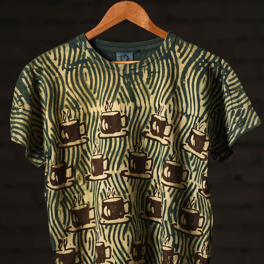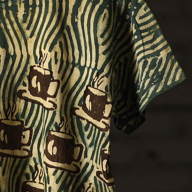 Fine quality pure cotton natural dyed special hand block printed unisex round neck half sleeve t-shirt. Contemporary designs made through traditional processes, by skilled fourth generation textile printers in Rajasthan. This slow fashion, hand block printed cotton shirt brings back the love for traditional skills, with a modern aesthetic and design.