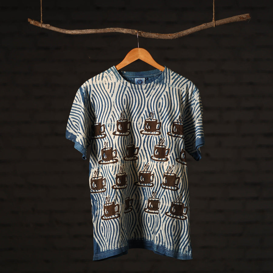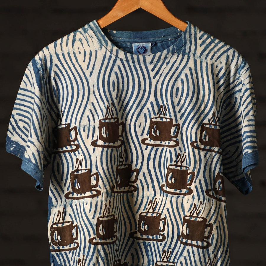 Fine quality blue pure cotton natural dyed special hand block printed unisex round neck half sleeve t-shirt. Contemporary designs made through traditional processes, by skilled fourth generation textile printers in Rajasthan. This slow fashion, hand block printed cotton shirt brings back the love for traditional skills, with a modern aesthetic and design.
