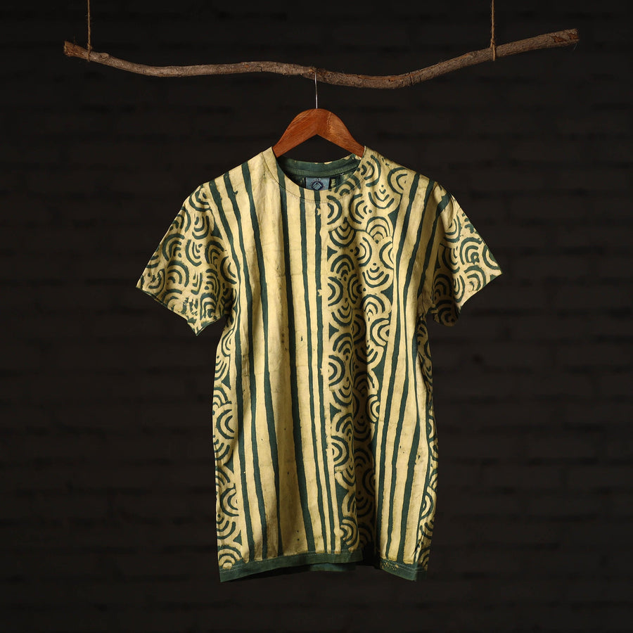 Fine quality pure cotton natural dyed special hand block printed unisex round neck half sleeve t-shirt. Contemporary designs made through traditional processes, by skilled fourth generation textile printers in Rajasthan. This slow fashion, hand block printed cotton shirt brings back the love for traditional skills, with a modern aesthetic and design.