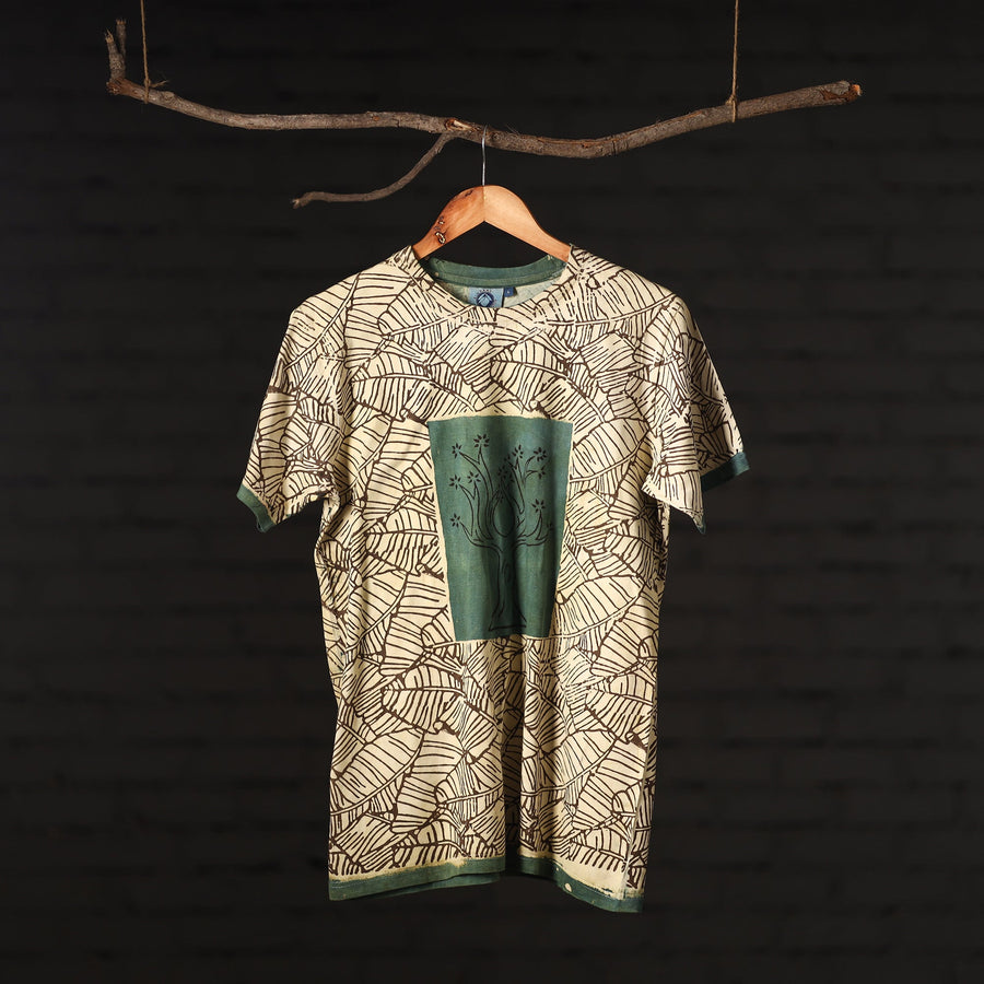 • Green - Beige - Bindaas Natural Dyed Art Block Print Round Neck T-shirt in Pure Cotton