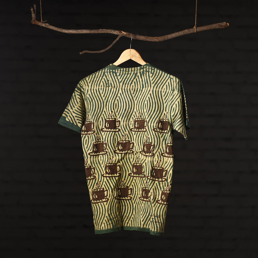 Fine quality pure cotton natural dyed special hand block printed unisex round neck half sleeve t-shirt. Contemporary designs made through traditional processes, by skilled fourth generation textile printers in Rajasthan. This slow fashion, hand block printed cotton shirt brings back the love for traditional skills, with a modern aesthetic and design.