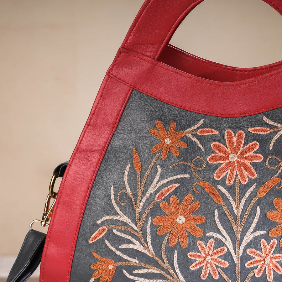 Fine quality original crewel hand embroidered hand bag with leather handle, made from embroidered velvet fabric & leather. It has one zipper and two simple pocket inside. Ample space to keep most of your essentials. Crewel work is a type of surface embroidery traditionally made in Kashmir using wool or silk yarn, silk is known for its beauty and natural elegance. A wide variety of different embroidery stitches are used to follow a design outline applied to the fabric. The technique is at least a thousand years old.