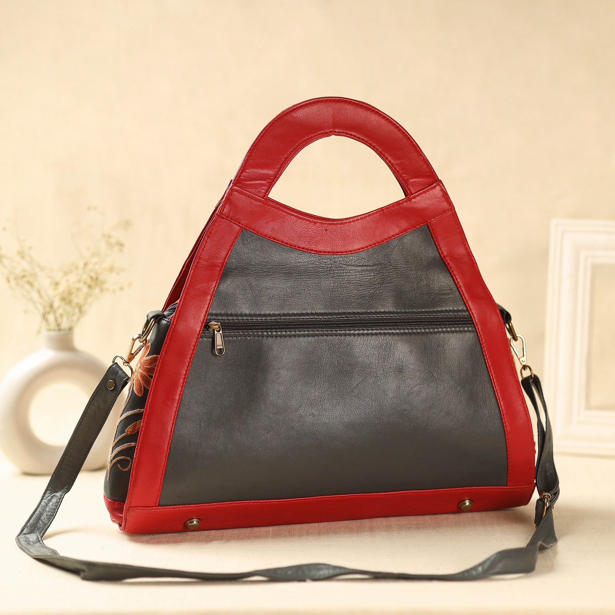 Fine quality Multicolor original crewel hand embroidered hand bag with leather handle, made from embroidered velvet fabric & leather. It has two partitions, one zipper, one simple pocket inside & one zipper pocket at backside. Ample space to keep most of your essentials. Crewel work is a type of surface embroidery traditionally made in Kashmir using wool or silk yarn, silk is known for its beauty and natural elegance. A wide variety of different embroidery stitches are used to follow a design outline applied to the fabric. The technique is at least a thousand years old.