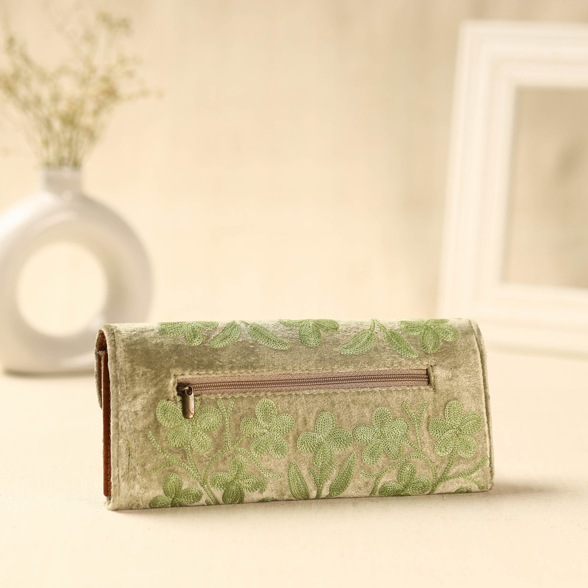 Fine quality original chain stitch beige crewel hand embroidered clutch, made from embroidered velvet fabric. It has two zipper pockets inside.