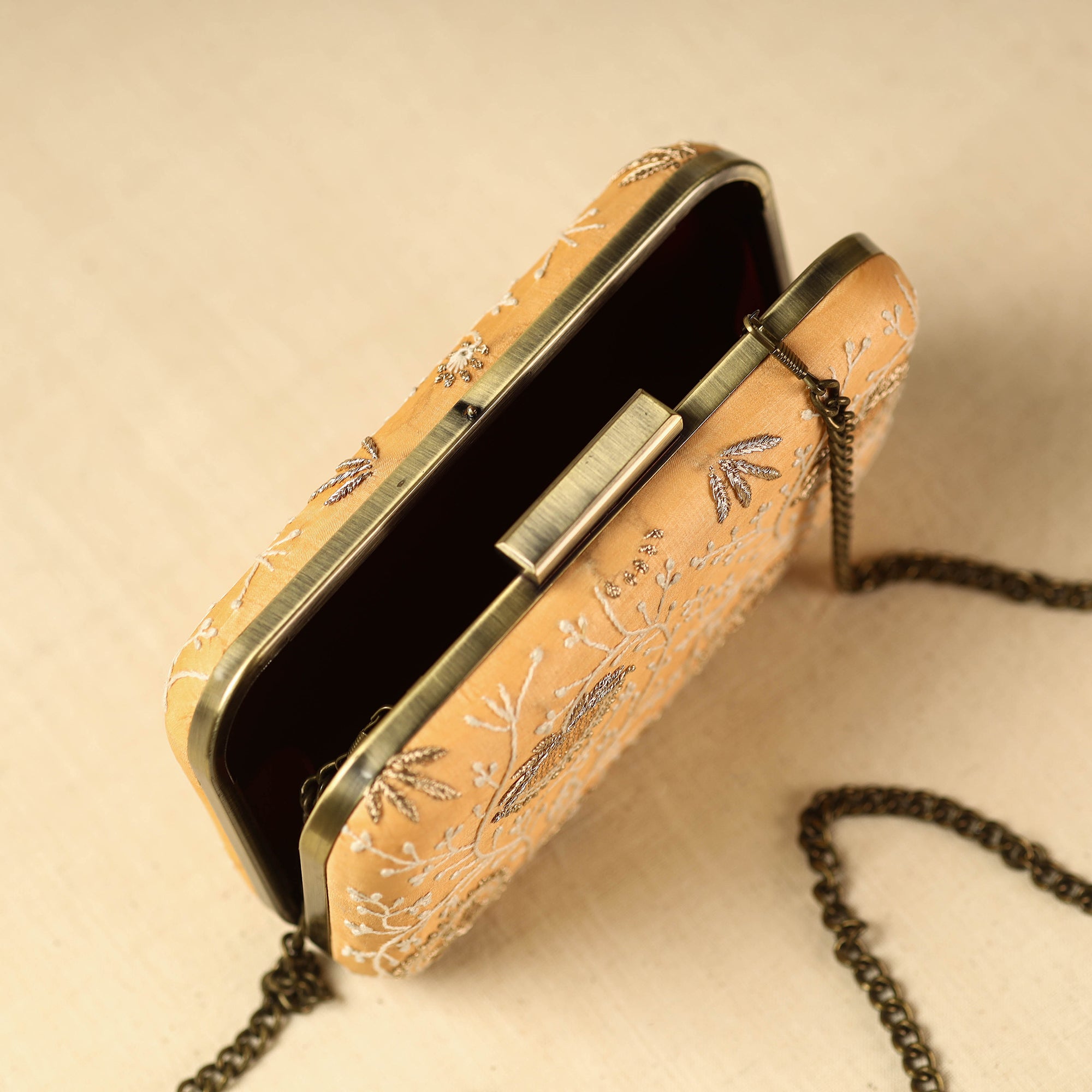 Intricate and artfully done orange lucknowi chikankari zari hand embroidered tussar silk clutch/sling bag with detachable sling. This bag can converted into clutch after detaching sling. It has velvet lining inside. Chikankari is a traditional textile decorative from Lucknow. It is very delicate and intricate hand embroidery work where thread is embroidered of cool, pastel shades on light fabrics.