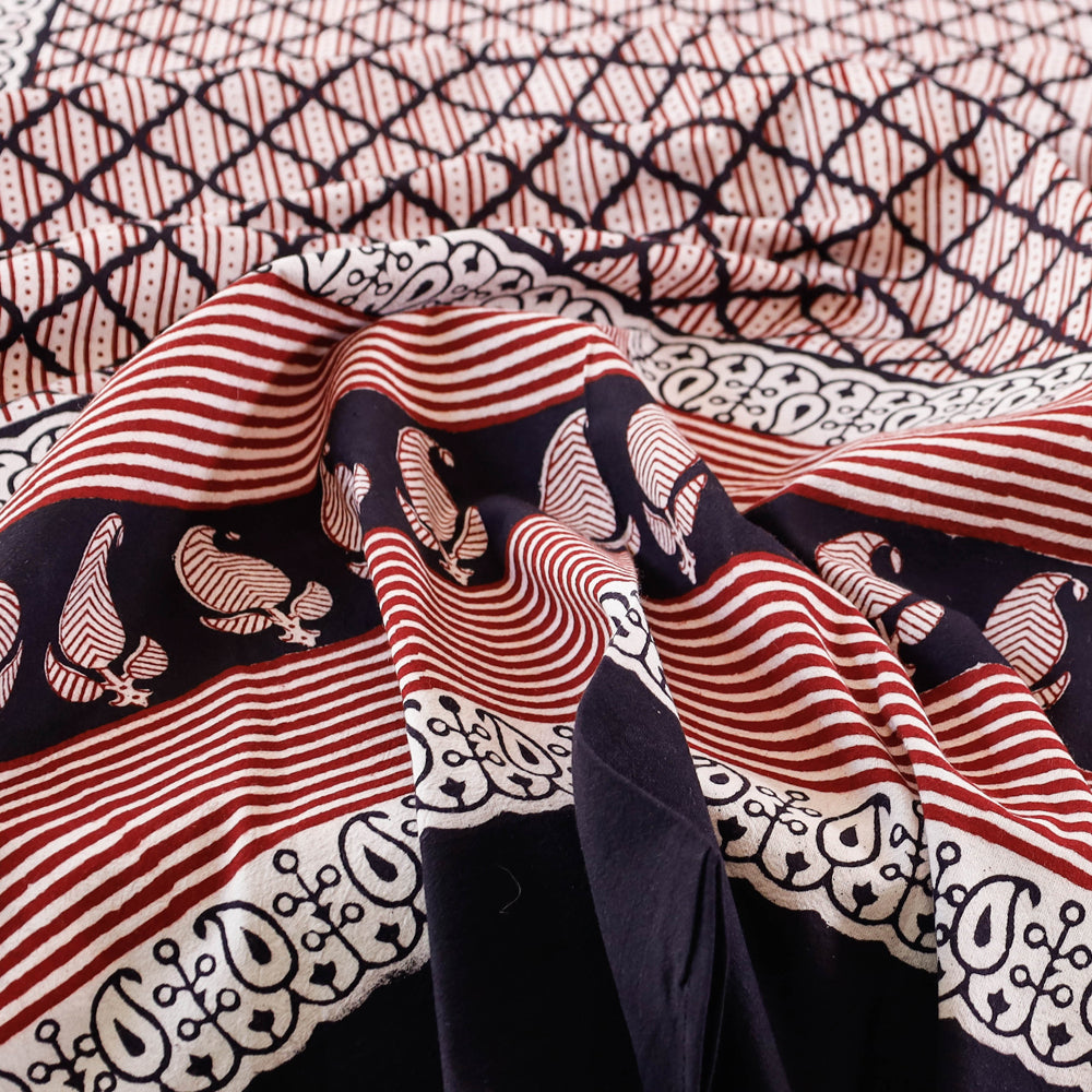 Fine quality black bagh hand block printed pure cotton single bed cover made using natural dyes through traditional process by Umar Faruk Khatri practiced in Bagh, the Dhar district of Madhya Pradesh.