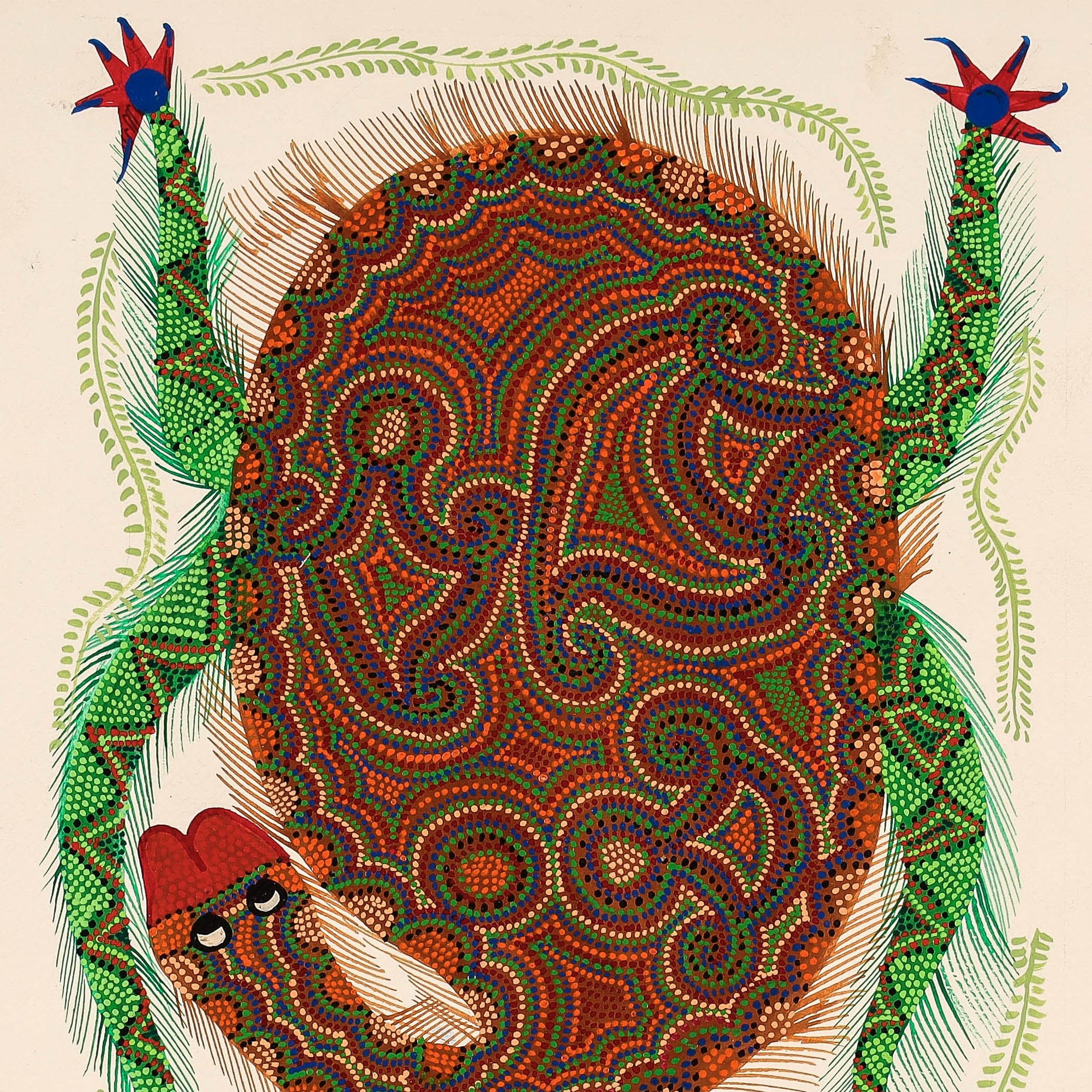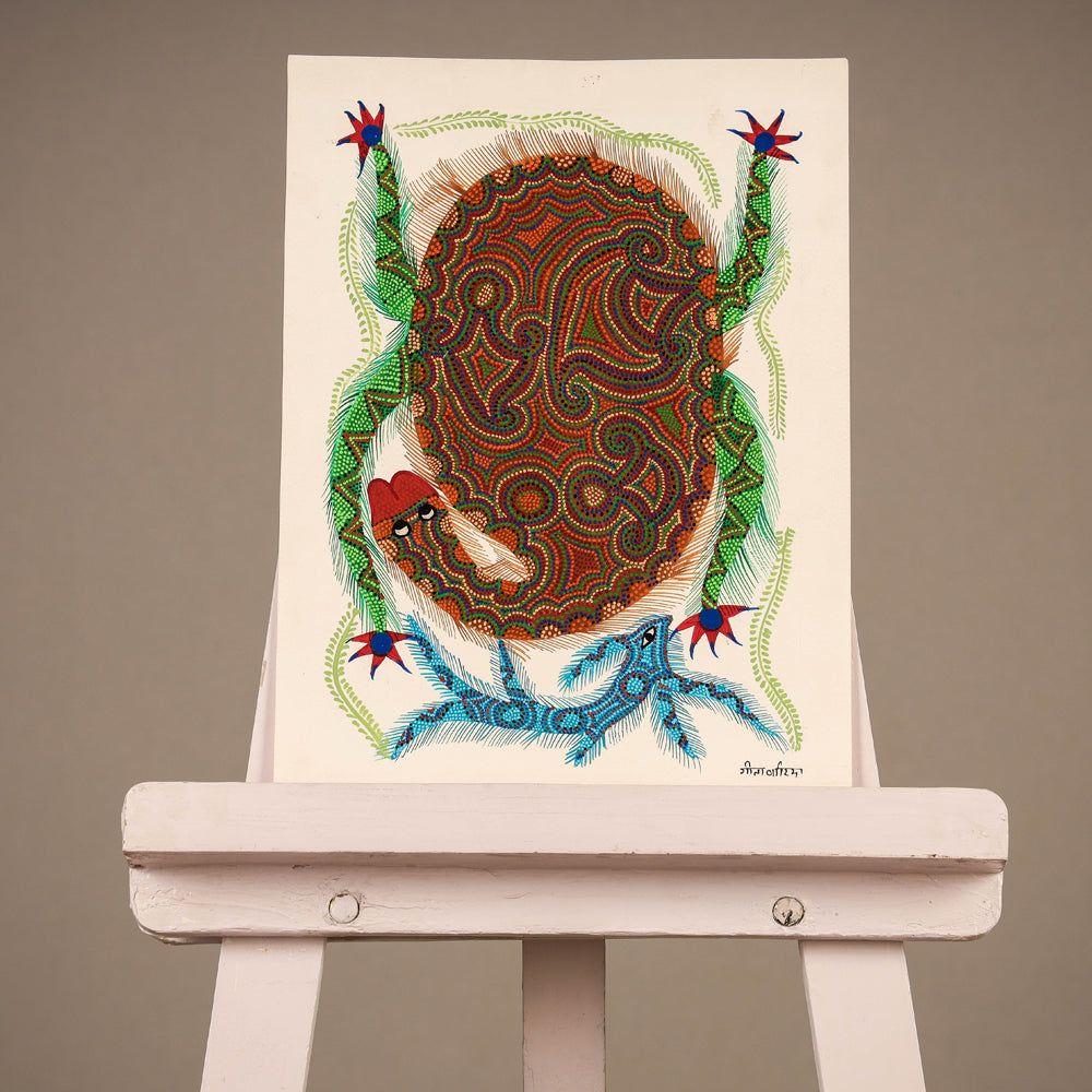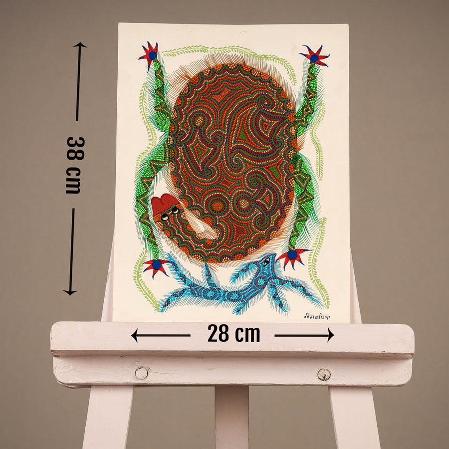 Traditional bhil pithora folk artwork on thick art paper with permanent ink & acrylic colours. This exquisite bhil art comes from the family of Geeta Bariya. Geeta is the daughter in law of Bhuribai famous Bhil artist. She learnt painting after she got married. She has participated in various workshops. The Bhils are the second largest tribe in India who reside in western and central India, in states of Madhya Pradesh, Gujarat, Rajasthan, and Maharashtra. The history of Bhil art is as old as the Bhils themselves. The art is simple images of everyday life of this tribe, the Bhils live close to nature and lead a largely agricultural life. Their paintings reflect the changing seasons, the natural phenomena that guide their harvest, and the gods that protect them. Their houses have beautiful frescos of images from myth and folklore on the walls and ceilings. Dots are the identity of Bhil art paintings. Dots of different colours on plain backgrounds are used to depict stories, memories and prayers.