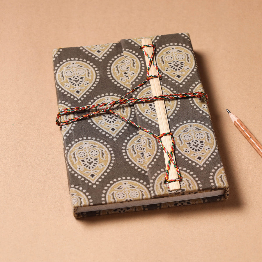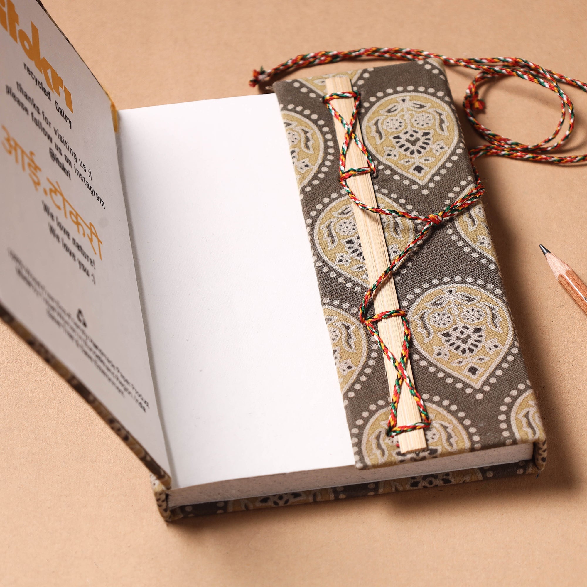 | Material | Fabric embellished hard bound cover thread lock notebook with handmade papers. This paper is made of cotton, paper and other natural fibre waste recycled in an eco-friendly manner without the use of chemicals. Hand made by master artisans who maintain careful personal attention to detail. They are highly skilled in a variety of bookbinding and handmade stationery manufacturing techniques. |