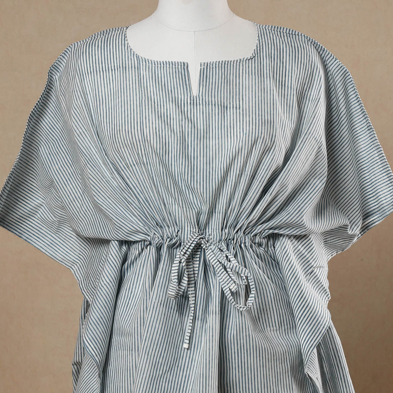 Fine quality hand block printed cotton short kaftan. A traditional kaftan or caftan is an short length garment with long, flowing sleeves. It has an adjustable drawstring waist. These loose-fitting cotton kaftans are enhanced by a soft touch and beautiful hand prints. This dress will allow you to move with ease and comfort. The drawstring waist tie will give you the freedom to customize the fit to suit your unique shape.