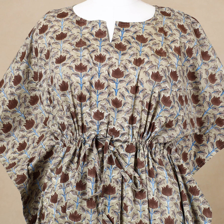 Fine quality hand block printed cotton long kaftan. A traditional kaftan or caftan is an ankle-length garment with long, flowing sleeves. It has an adjustable drawstring waist. These loose-fitting cotton kaftans are enhanced by a soft touch and beautiful hand prints. This dress will allow you to move with ease and comfort. The drawstring waist tie will give you the freedom to customize the fit to suit your unique shape.